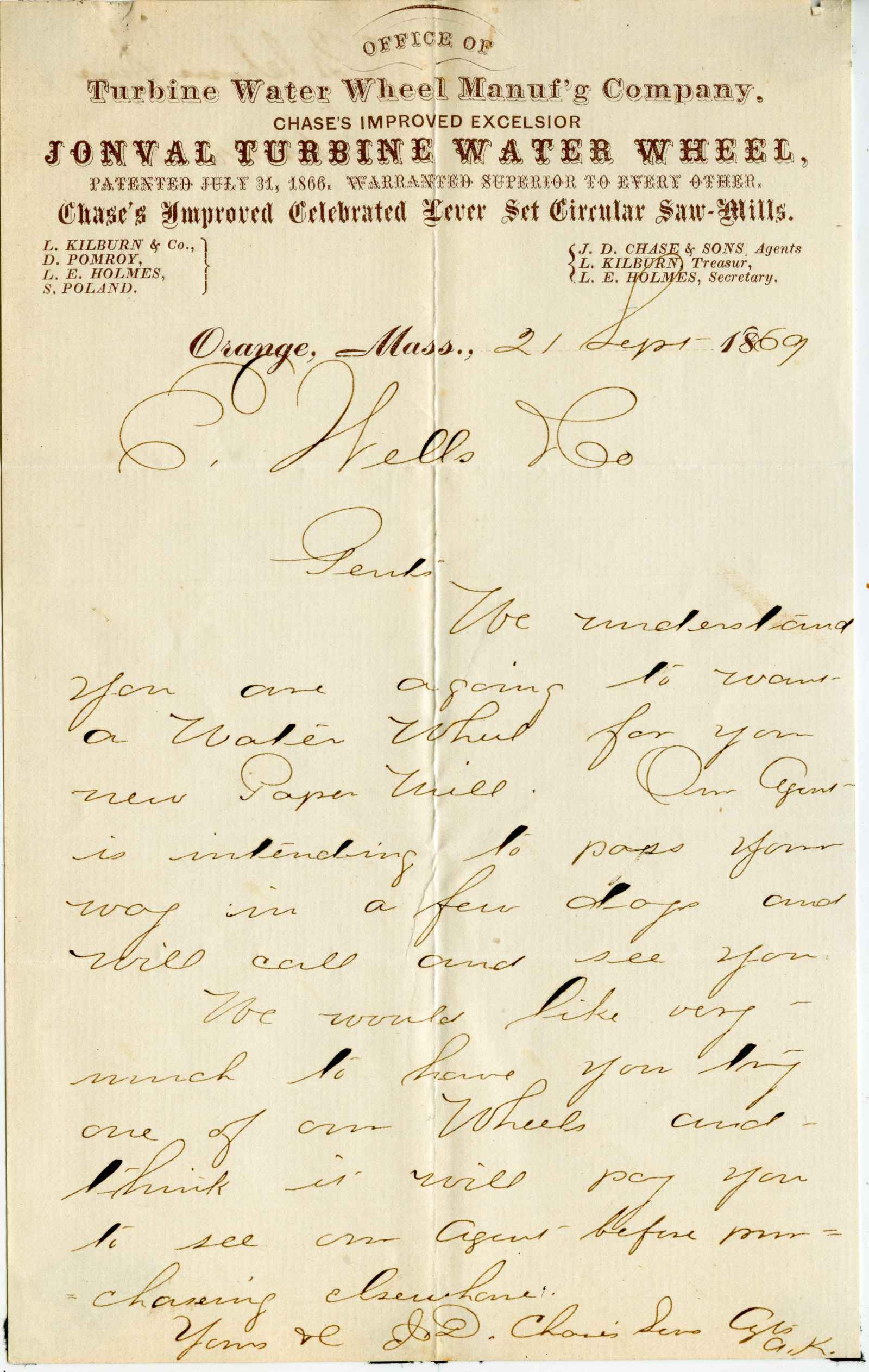 letter; Chase, J. D. - Jonval Turbine Water Wheel - Orange, Ma.