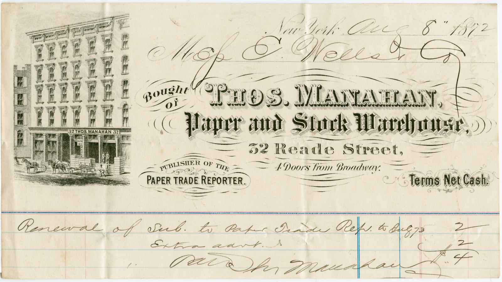 invoice; Manahan, Thomas - Paper & Stock Warehouse - N.Y.