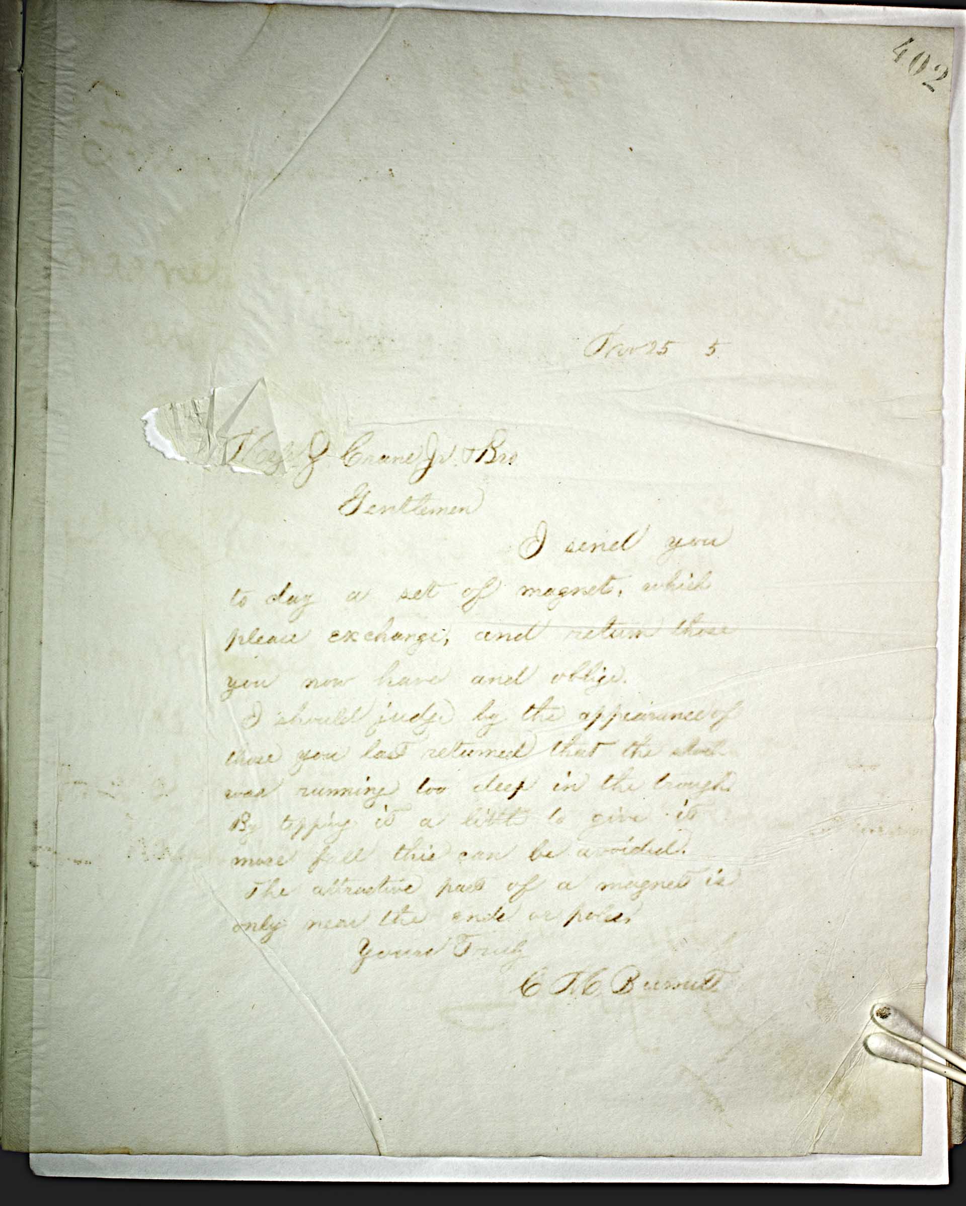 Nov. 25, 5 [1885] -- J. Crane Jr. & Bro. -- Gentlemen, -- I send you to day a set of magnets, which please exchange, and return those you now have and oblige. -- I should judge by the appearance of those you last returned that the stack was over running too deep in the trough. -- By tipping it a little to give it more fall this can be avoided. -- The attractive part of a magnet is only near the ends or poles. -- Yours Truly -- C.M. Burnett --