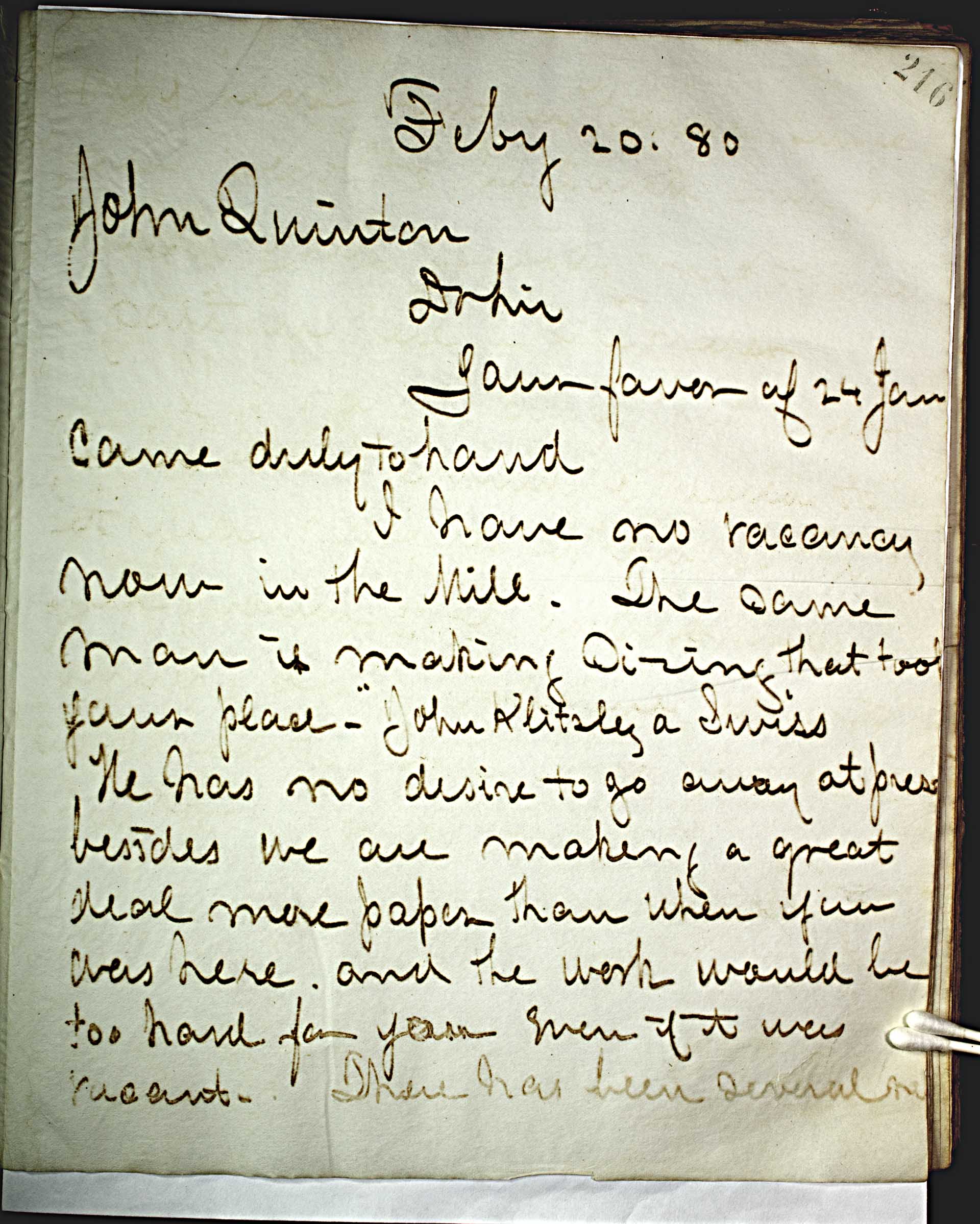 Feby 20- 80 [1880] -- John Quinton -- Dr Sir, -- Your favor of 24 Jan came duly to hand. -- I have no vacancy now in the mill. The same man is making [Sizing] that took your place. John Klitsler a Swiss. -- He has no desire to go away at present besides we are making a great deal more paper than when you was here and the work would be too hard for you even if it was vacant. There has been several new --