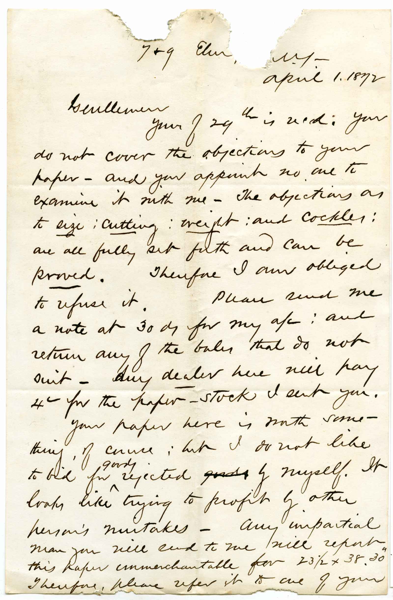 incoming correspondence to the papermaking company of Elisha Wells - circa 1870
