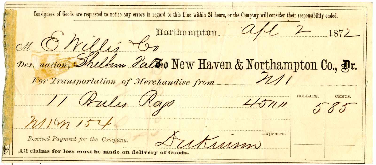 receipt; New Haven & Northampton R.R. - Transportation of rags - Northampton, Ma.