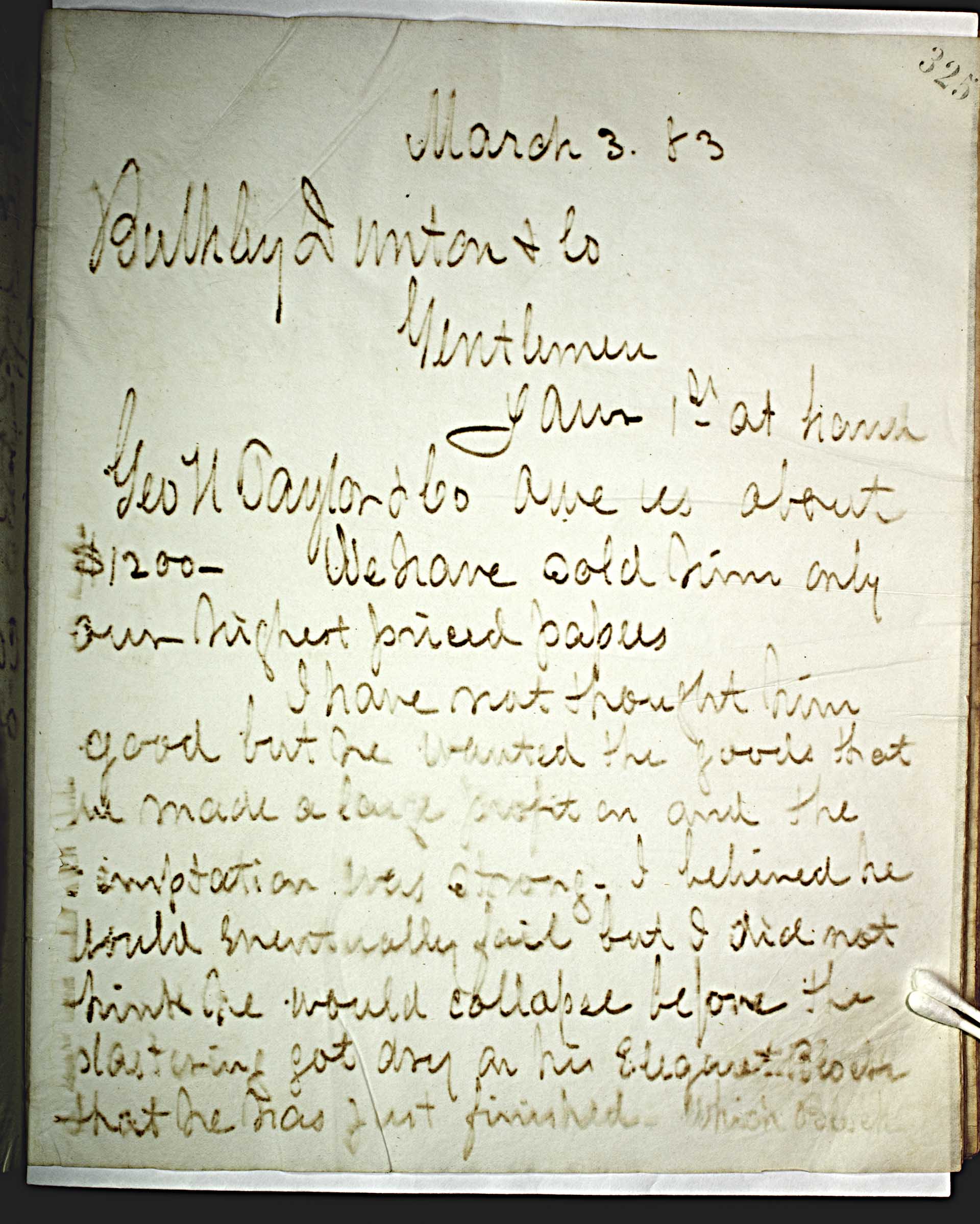 March 3, 83 [1883] -- Bulkley Dunton & Co. -- Gentlemen, -- Your 1 -- st -- at hand. -- Geo. H. Taylor & Co. owe us about $1200. We have sold him only our highest priced papers -- I have not thought him good but he wanted the goods that we made a large profit on and the temptation was strong. I believed he would eventually fail but I did not think he would collapse before the plastering got dry on his elegant house that he has just finished. Which block --