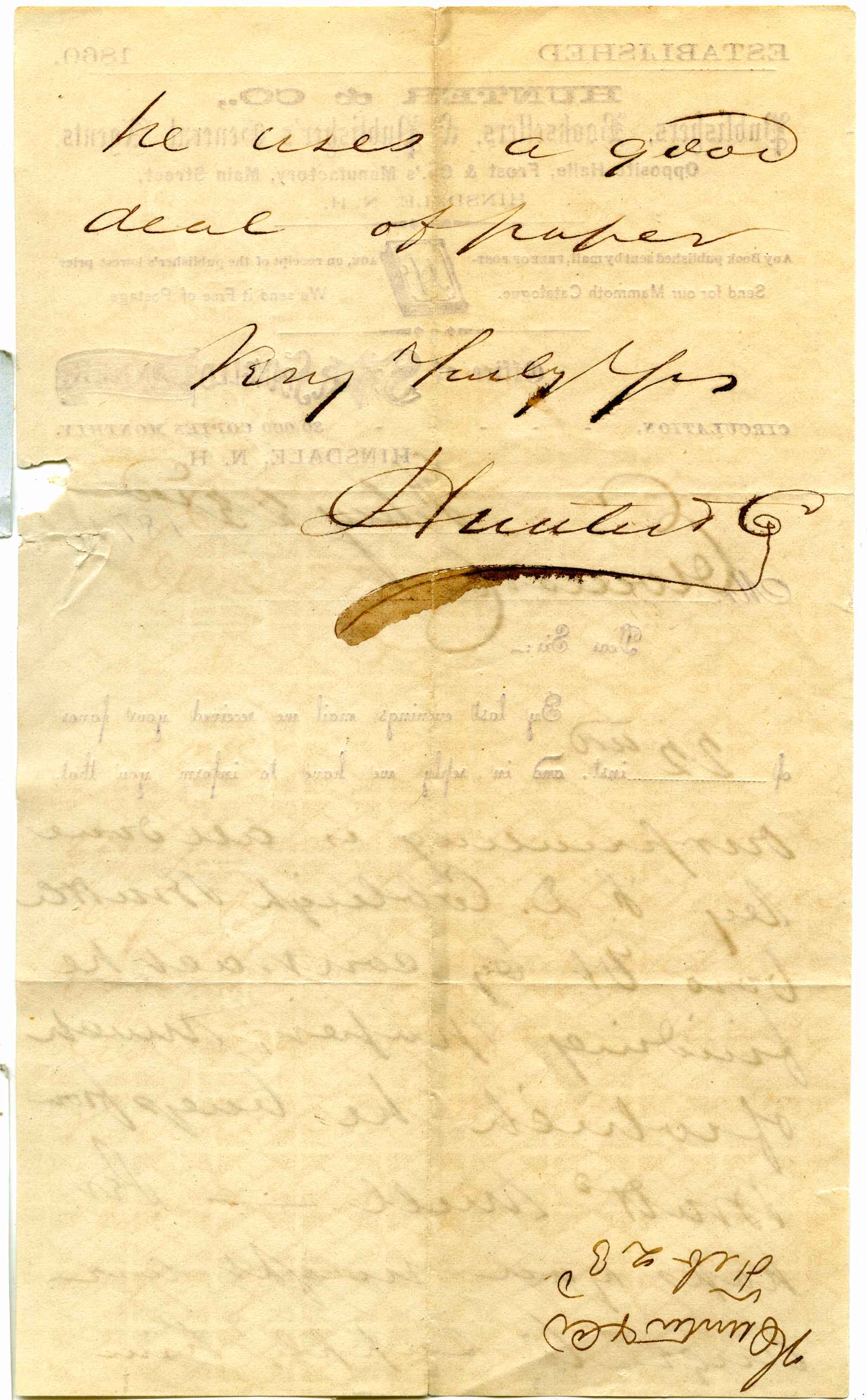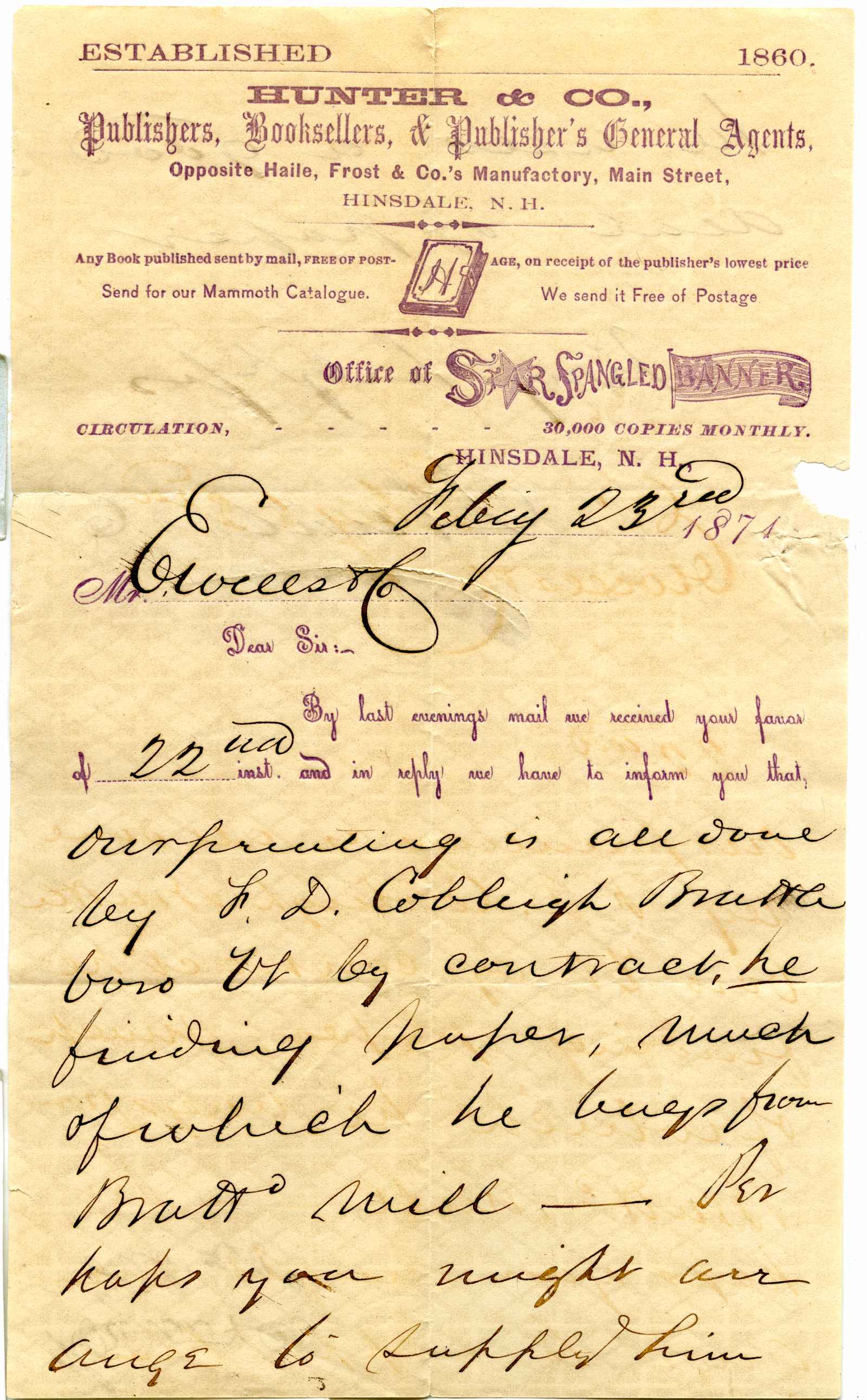 letter; Hunter & Co. - Publishers, Booksellers - Hinsdale, N. H.