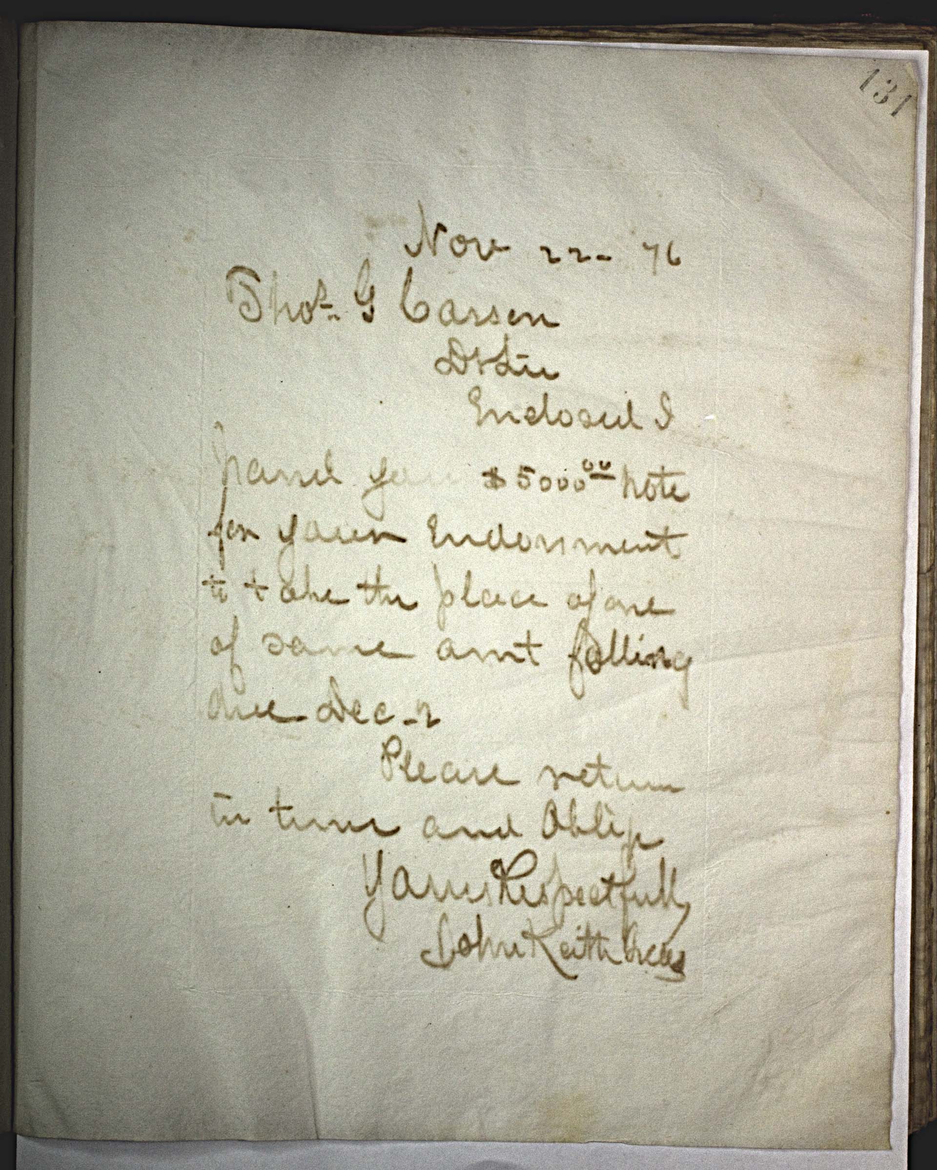 Nov 22 6 [1876] -- Tho -- s -- G. Carson -- Dear Sir, -- Enclosed I hand you $5000.00 -- note for your endorsement to take the place of one of same amt falling due Dec. 2. -- Please return in time and oblige. -- Yours Respectfully -- John Keith Pres --