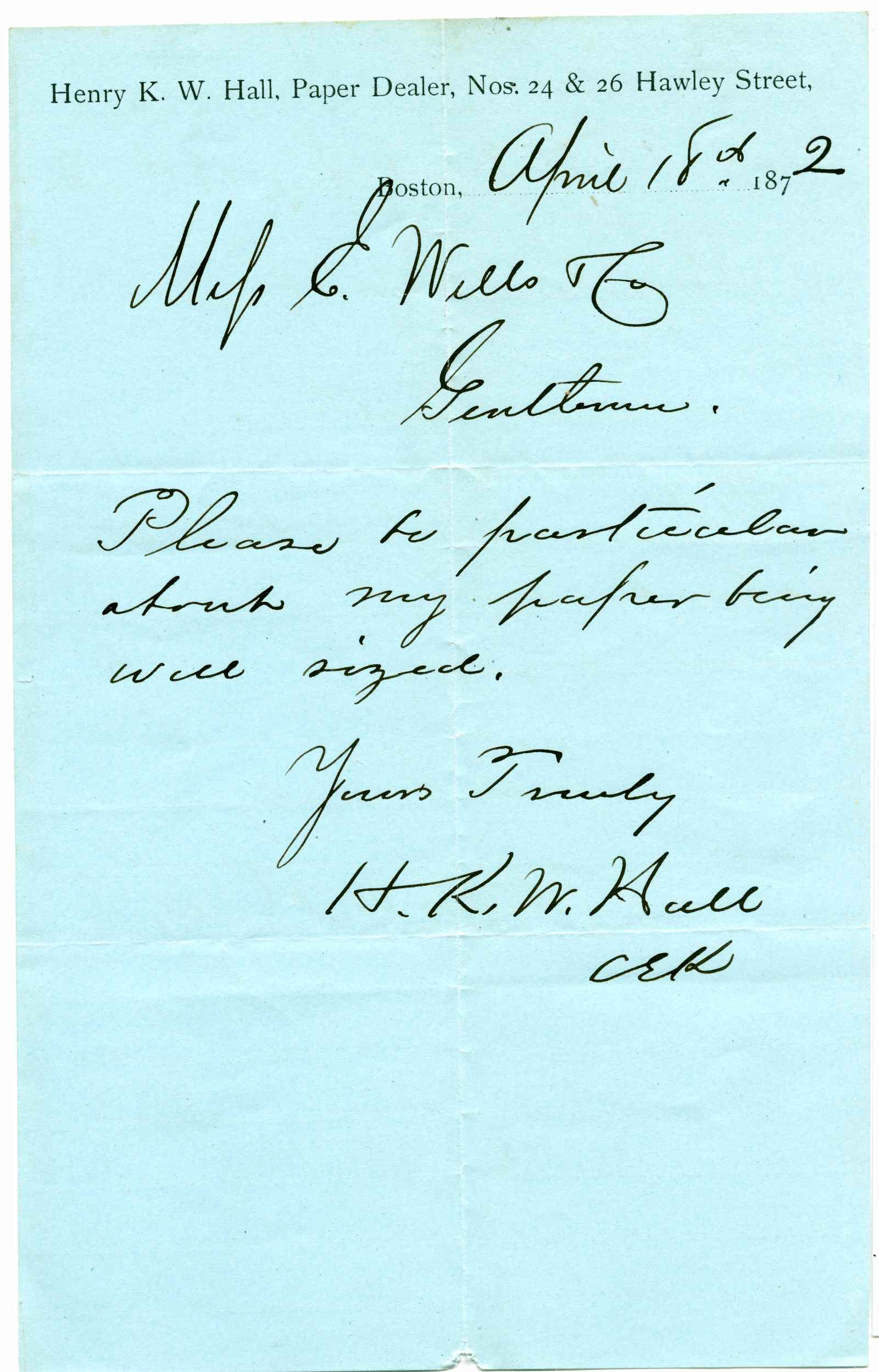 letter; Hall, Henry K.W. - Paper & Twine Dealer - Boston