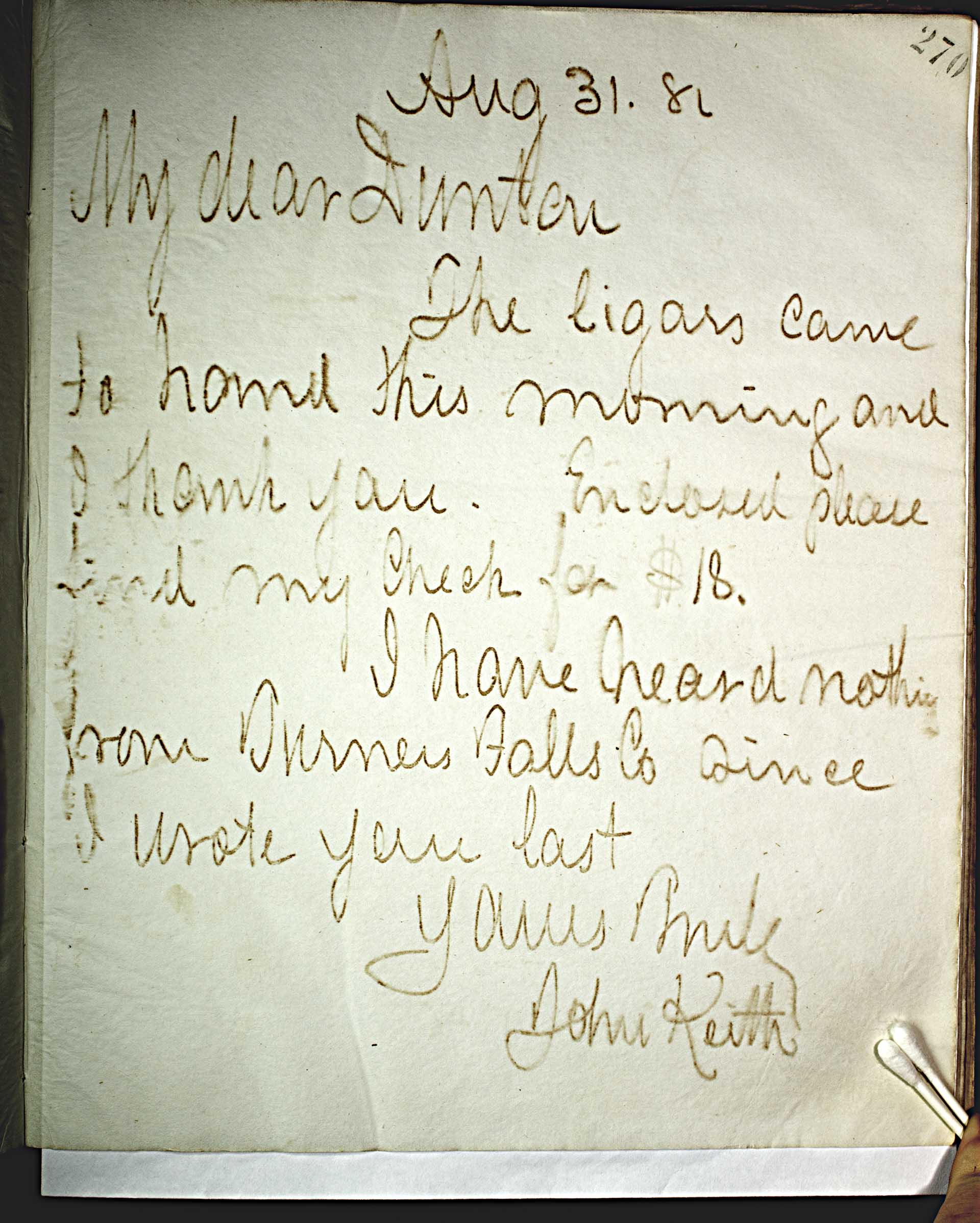 Aug 31, 81 [1881] -- My Dear Dunton, -- The cigars came to hand this morning and I thank you. Endorsed please find my check for $18. -- I have heard nothing from Turners Falls Co since I wrote you last. -- Yours Truly -- John Keith -- --
