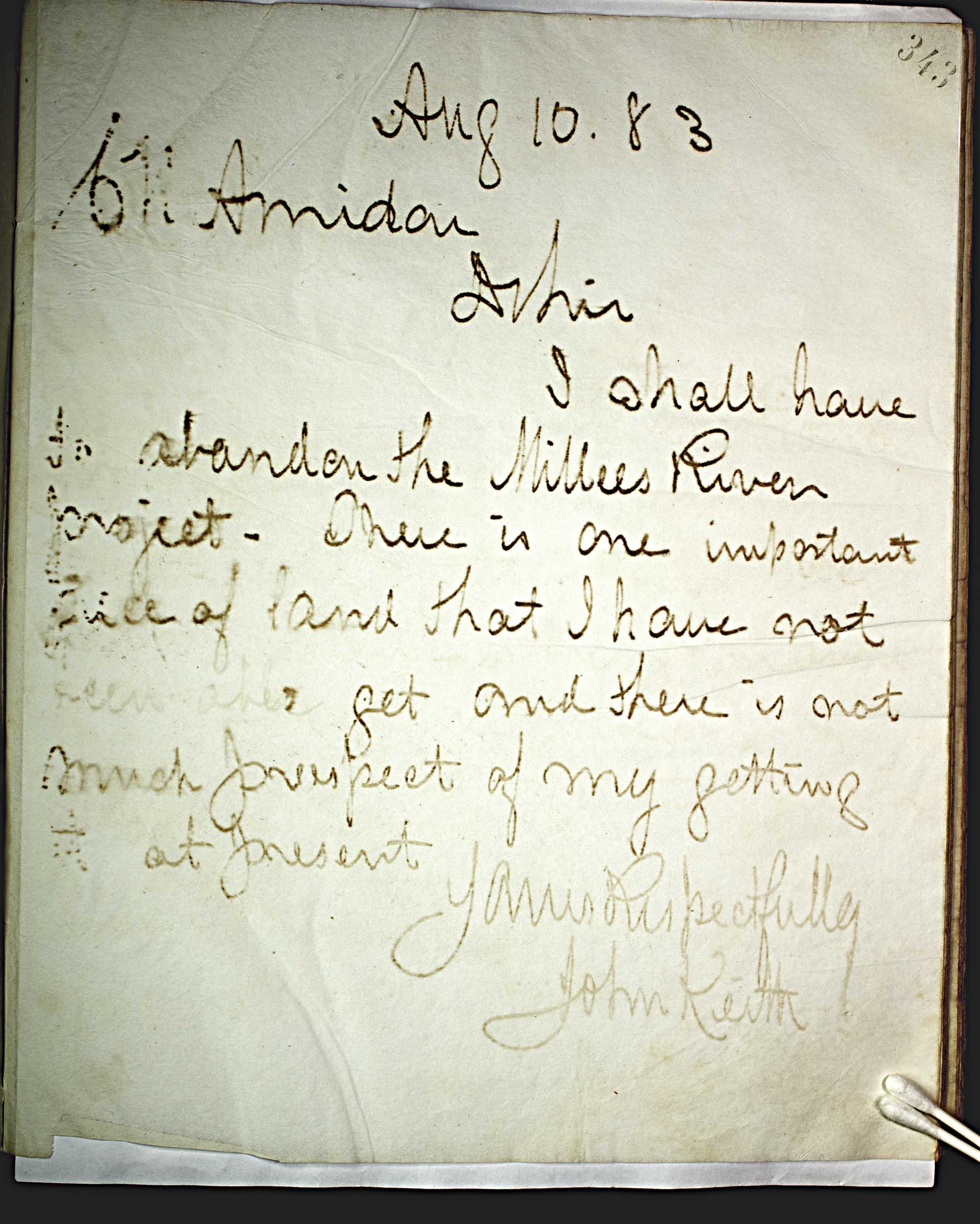 Aug 10, 83 [1883] -- B.N. Amidon -- Dr Sir, -- I shall have to abandon the Millers River project. There is one important piece of land that I have not been able to get and there is not much prospect of my getting it at present. -- Yours Respectfully -- John Keith --