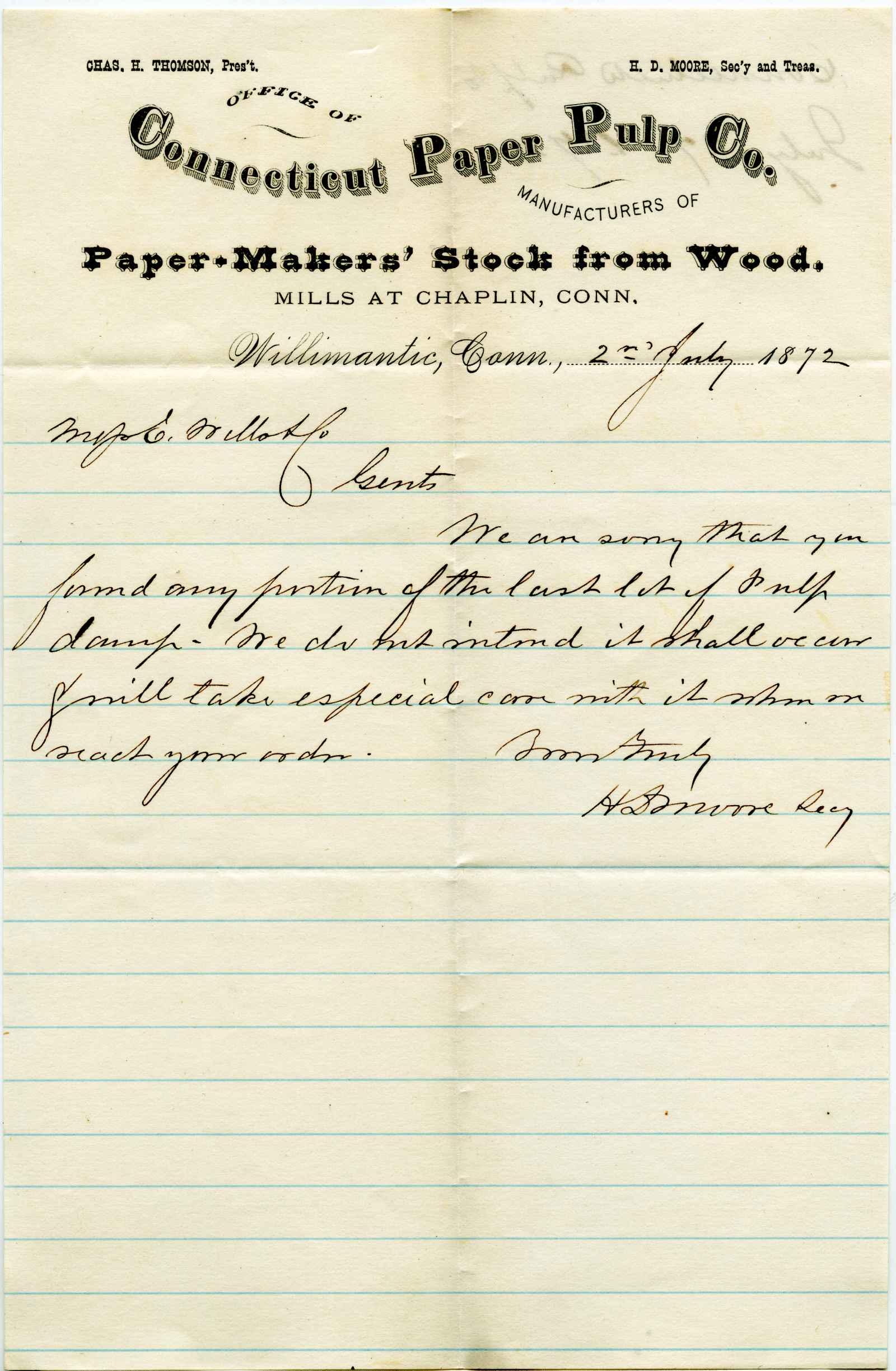 letter; Connecticut Paper Pulp Company - Paper Maker's Stock From Wood - Willimantic, Ct.