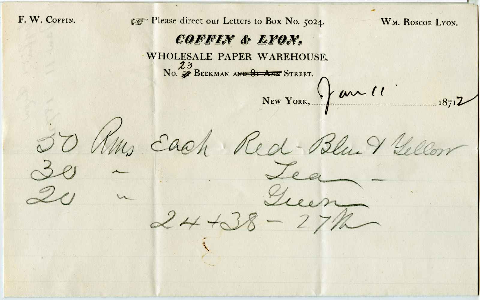 letter; Coffin & Lyon - Wholesale Paper Warehouse - N.Y.