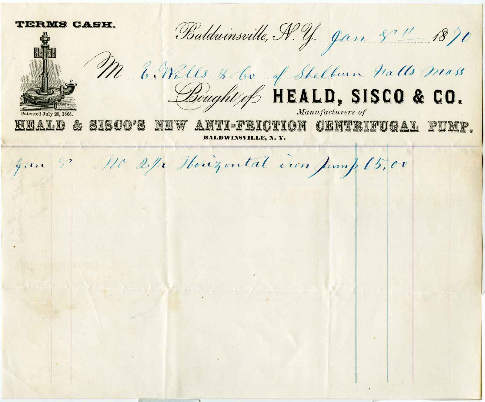 invoice; Heald, Sisco & Co. - Anti - Friction Centrifugal pumps - Baldwinsville, N.Y.
