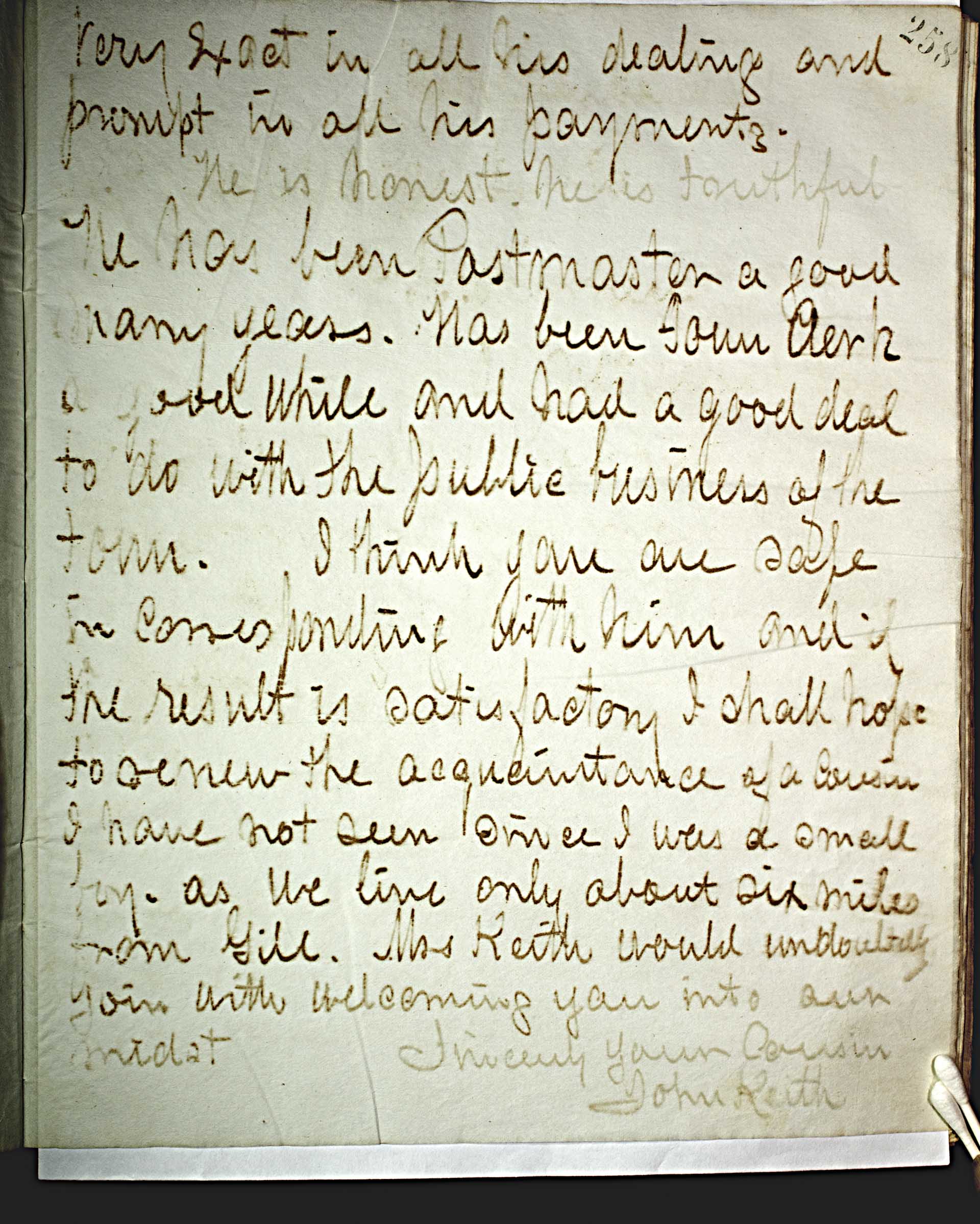 very exact in all his dealing and prompt in all his payments. -- He is honest. He is truthful. -- He has been Post master a good many years. Has been Town Clerk a good while and had a good deal to do with the public business of the town. I think you are safe in corresponding with him and if the result is satisfactory I shall have to renew the acquaintance of a cousin I have not seen since I was a small boy, as we live only about six miles from Gill. Mrs Keith would undoubtedly join with welcoming you into our midst. -- Sincerely your Cousin -- John Keith --