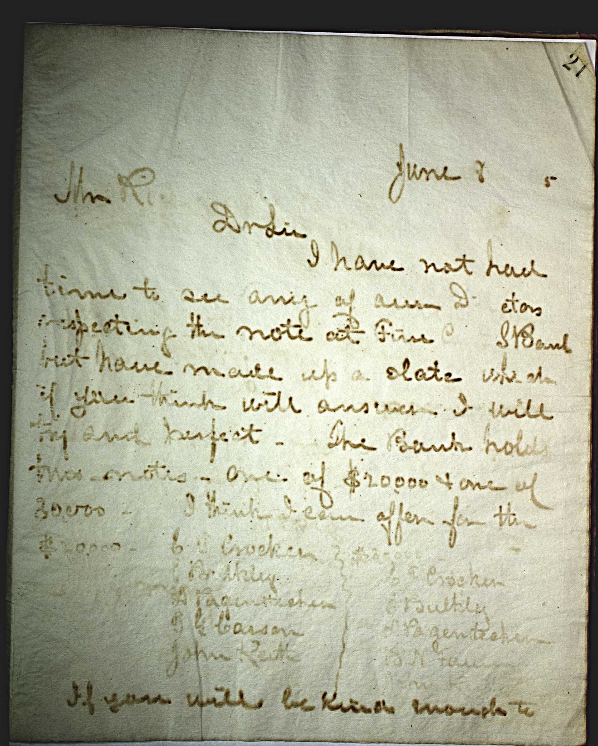 June 8 5 (1875) -- Mr Rice -- Dr Sir -- I have not had time to see any of our Directors respecting the note at Five Cents S Bank but have made up a slate which if you think will answer I will try and perfect - The Bank holds these notes - one of $20,000 & one of 30,000 - I think I can offer for this -- $20,000 -- C T Crocker -- E Bulkley -- A. Pagenstecher -- J. G. Carson -- John Keith -- $30,000 -- C T Crocker -- E Bulkley -- A. Pagenstecher -- BN Farren -- John Keith -- If you will be kind enough to