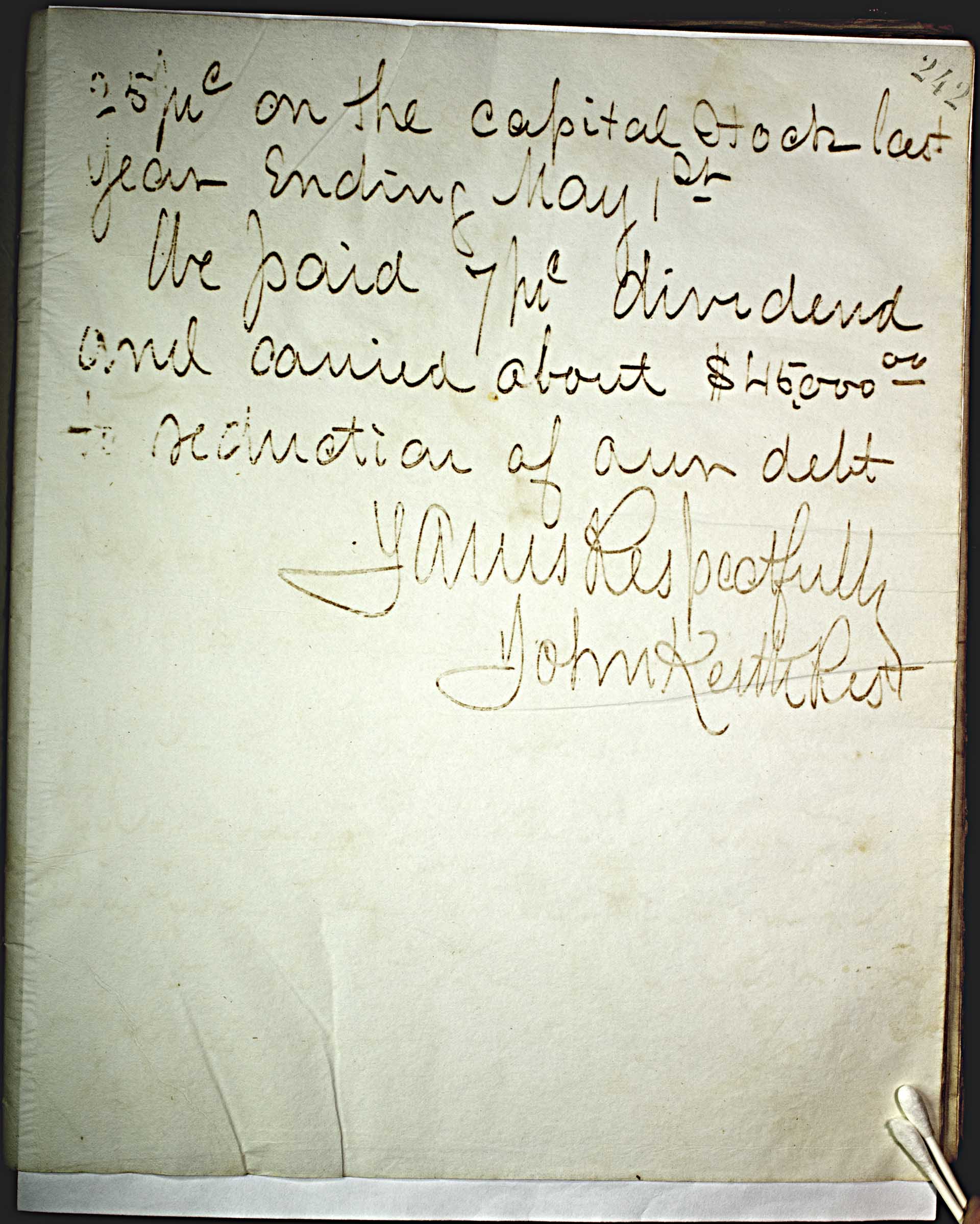 | dc.description | 25 -- prc -- on the capitol stock last year ending May 1 -- st -- . -- We paid 7 -- prc -- dividend and carried about $45000.00 -- to reduction of our debt. -- Yours Respectfully -- John Keith Prest -- | |