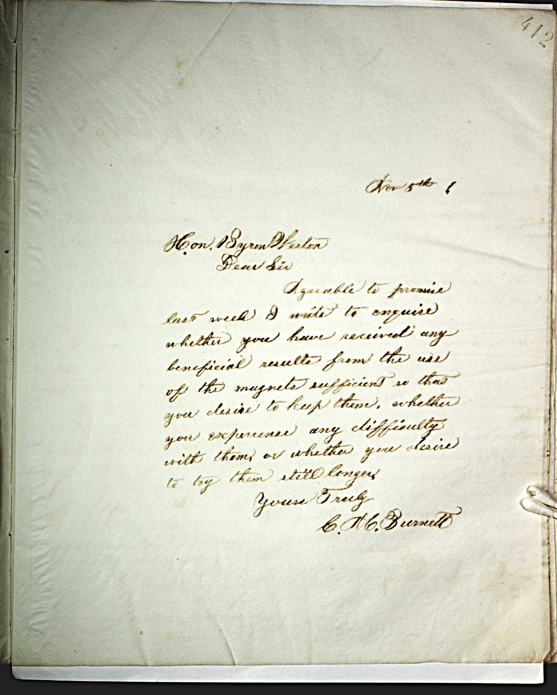 November 5, 6 (1886) -- Hon. Byron Weston -- Dear Sir, -- Agreeable to promise last week I write to inquire whether you have received any beneficial results from the use of the magnets sufficient so that you desire to keep them whether you experience and difficulty with them or whether you desire to try them still longer. -- -- Yours Truly -- C.M. Burnett