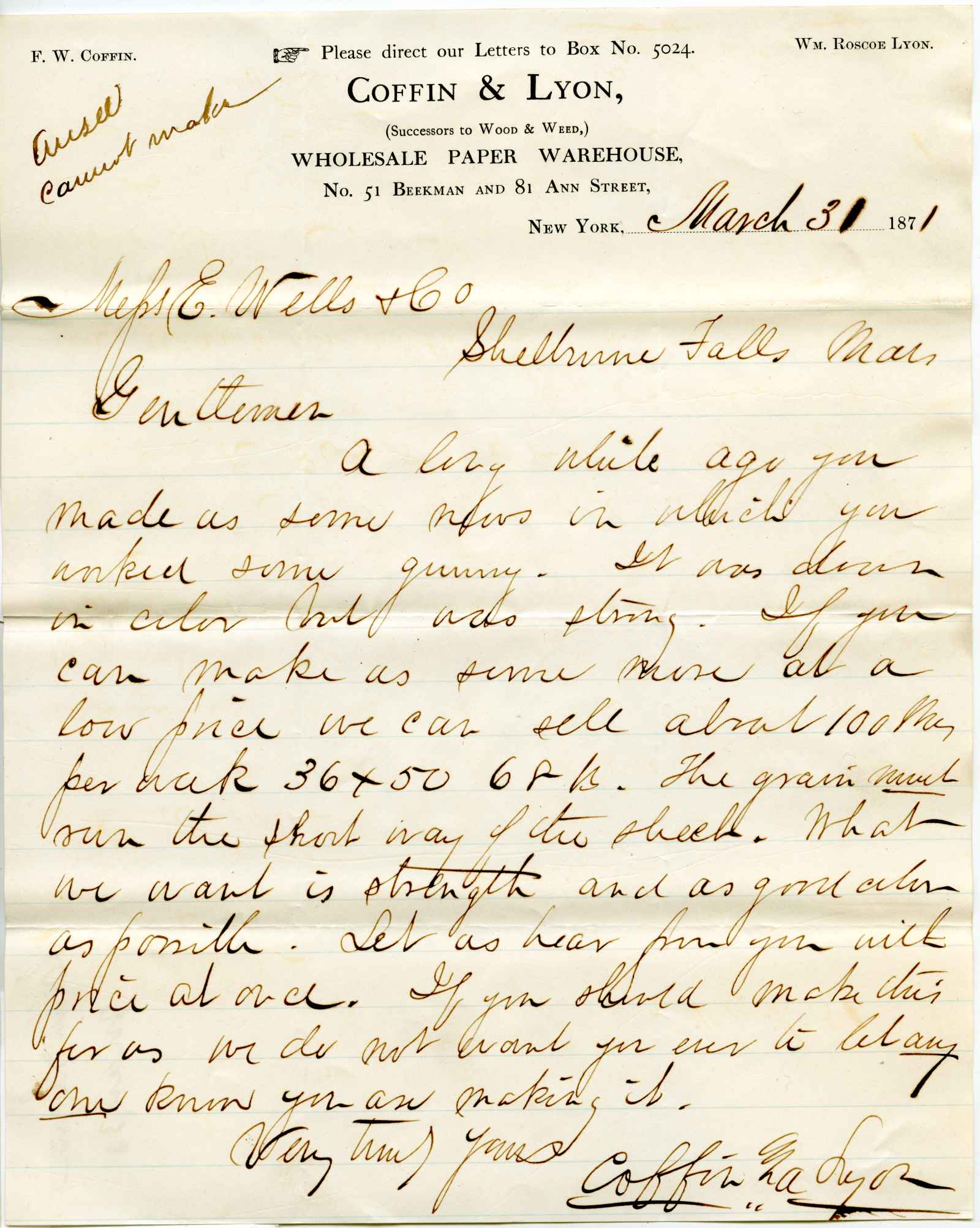 letter; Coffin & Lyon - Wholesale Paper Warehouse - N.Y.