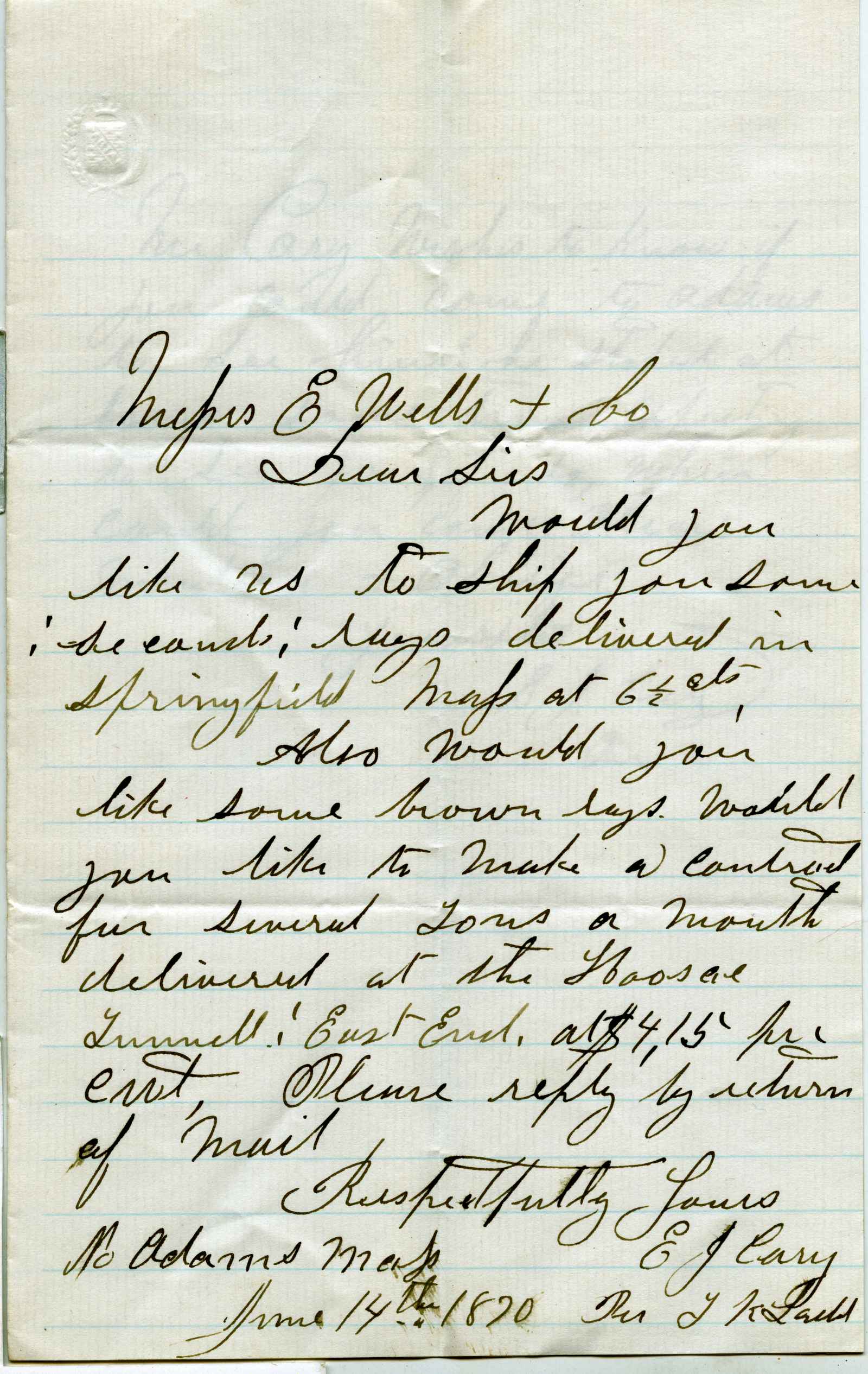 incoming correspondence to the papermaking company of Elisha Wells - circa 1870