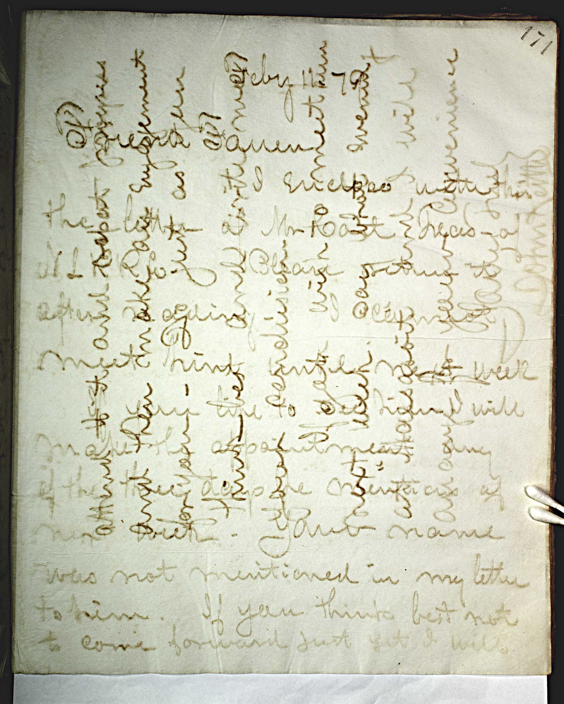 Feby 11 79 [1879] -- Friend Farren, -- Enclosed with this the letter at Mr Root Treas ‒ of L R Root. Please return it after so reading. I cannot meet him until next week so you have to see him. I will make the arrangement any of the three days he mentions of next week. Your name was not mentioned in my letter to him. If you think best not to come forward just yet I will -- -- [Editor – the following is aparently a part of another undated letter. This is the text that appears vertically in the image] -- Attend to it and [report] [progress] and then make an engagement for you. Do just as you think best and write me your conclusion. -- If you wish to meet him next week, say what evening at Massasoit and I will arrange for your convenience -- Yours Truly -- John Keith --