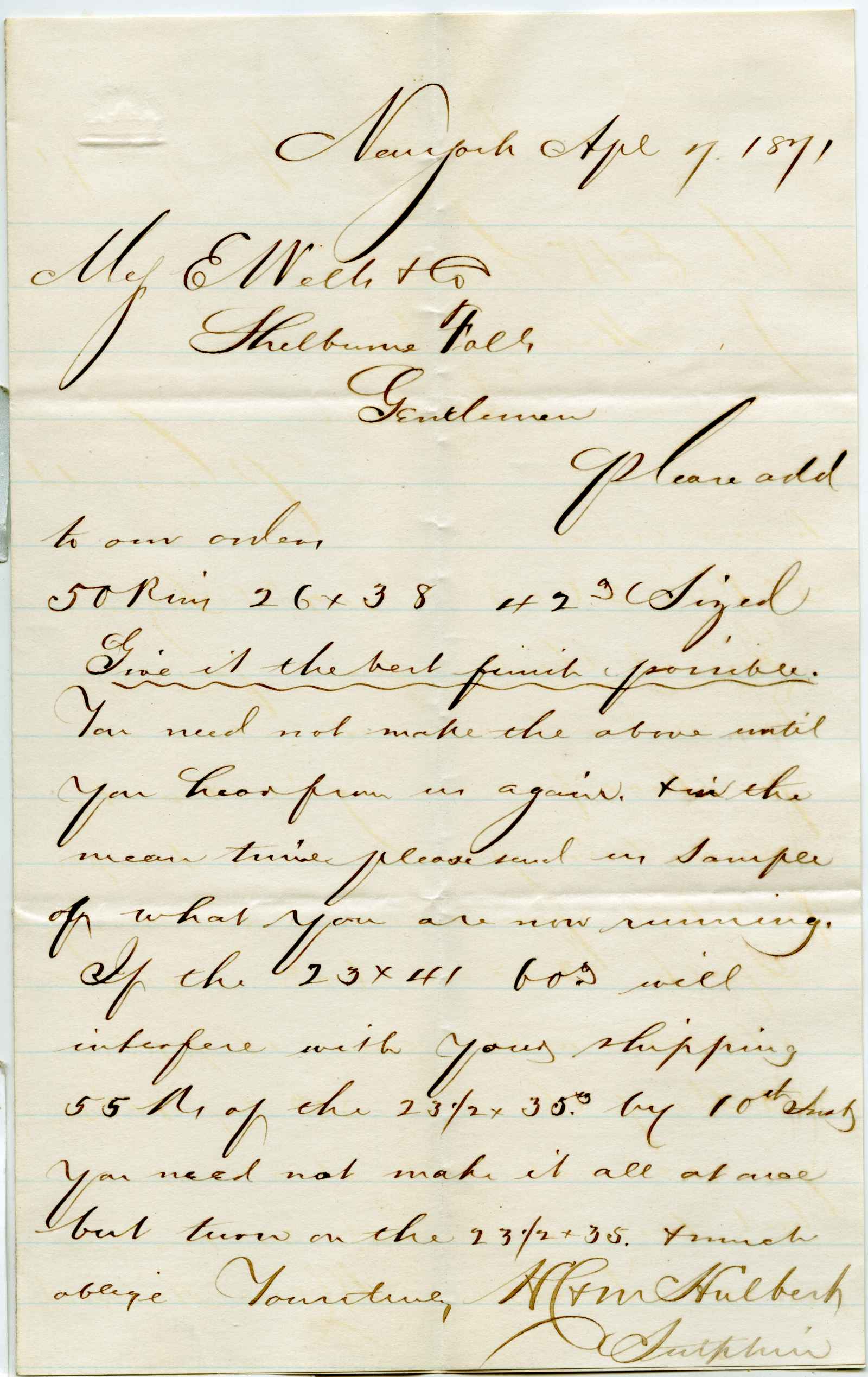 incoming correspondence to the papermaking company of Elisha Wells - circa 1870