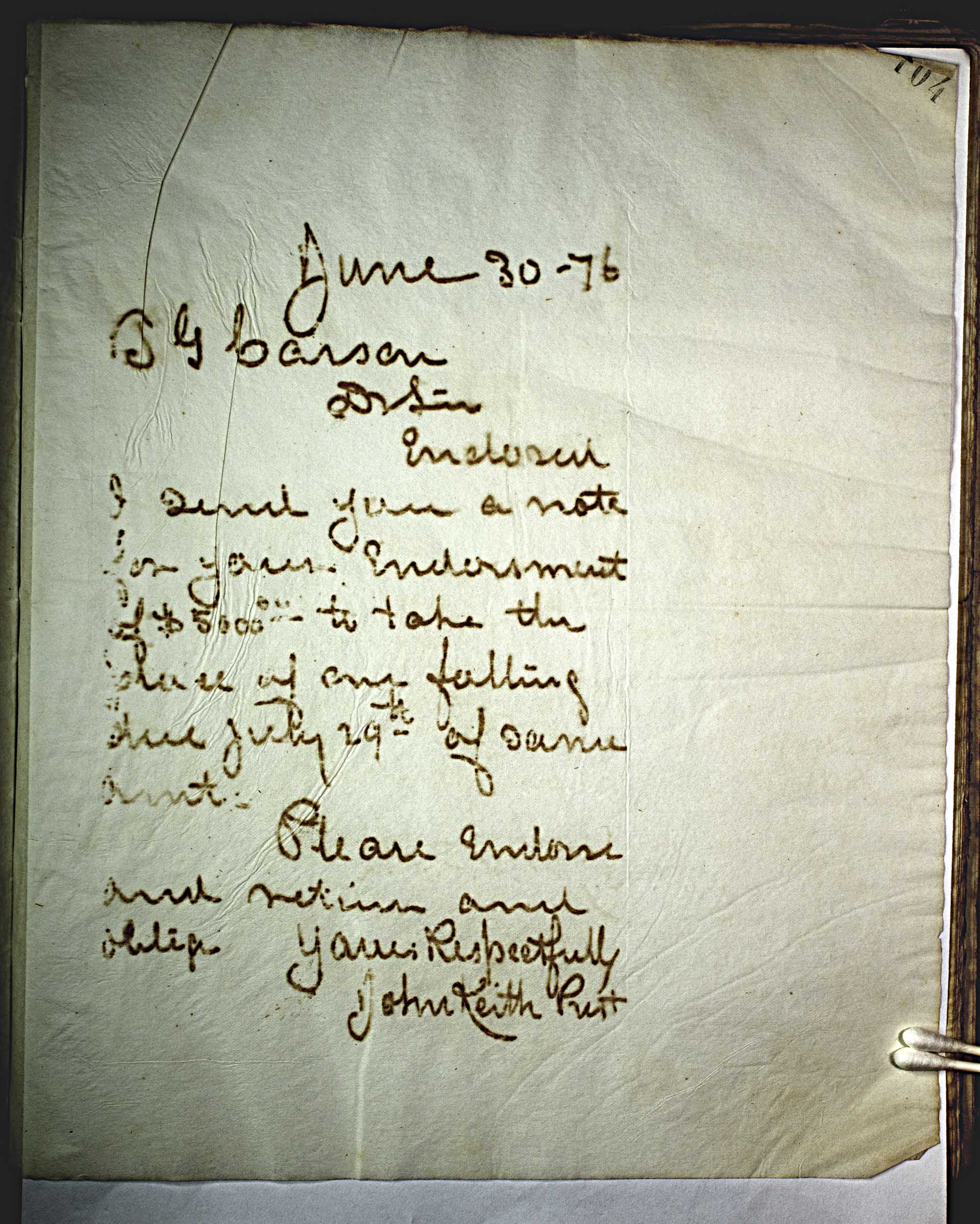 June 30 76 [1876] -- T. G. Carson -- Dear Sir, -- Enclosed I send you a note for your endorsement of &5000.00 -- – to take the place of any falling due July 29th of same amt. -- Please endorse and return oblige.      Yours Respectfully  John Keith Prest --