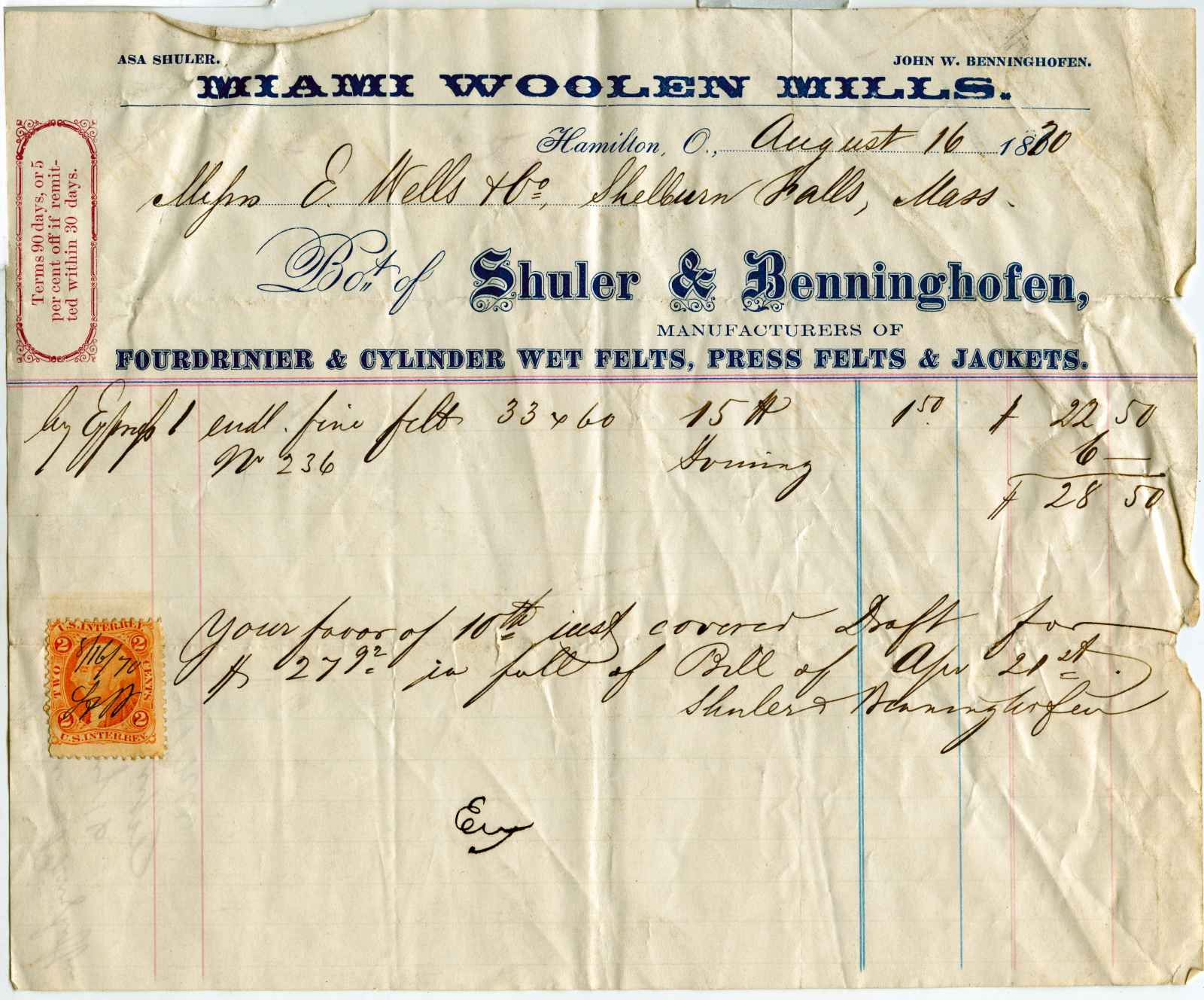 receipt; Miami Woolen Mill - Felt sales, price reduction - Hamilton, Oh.