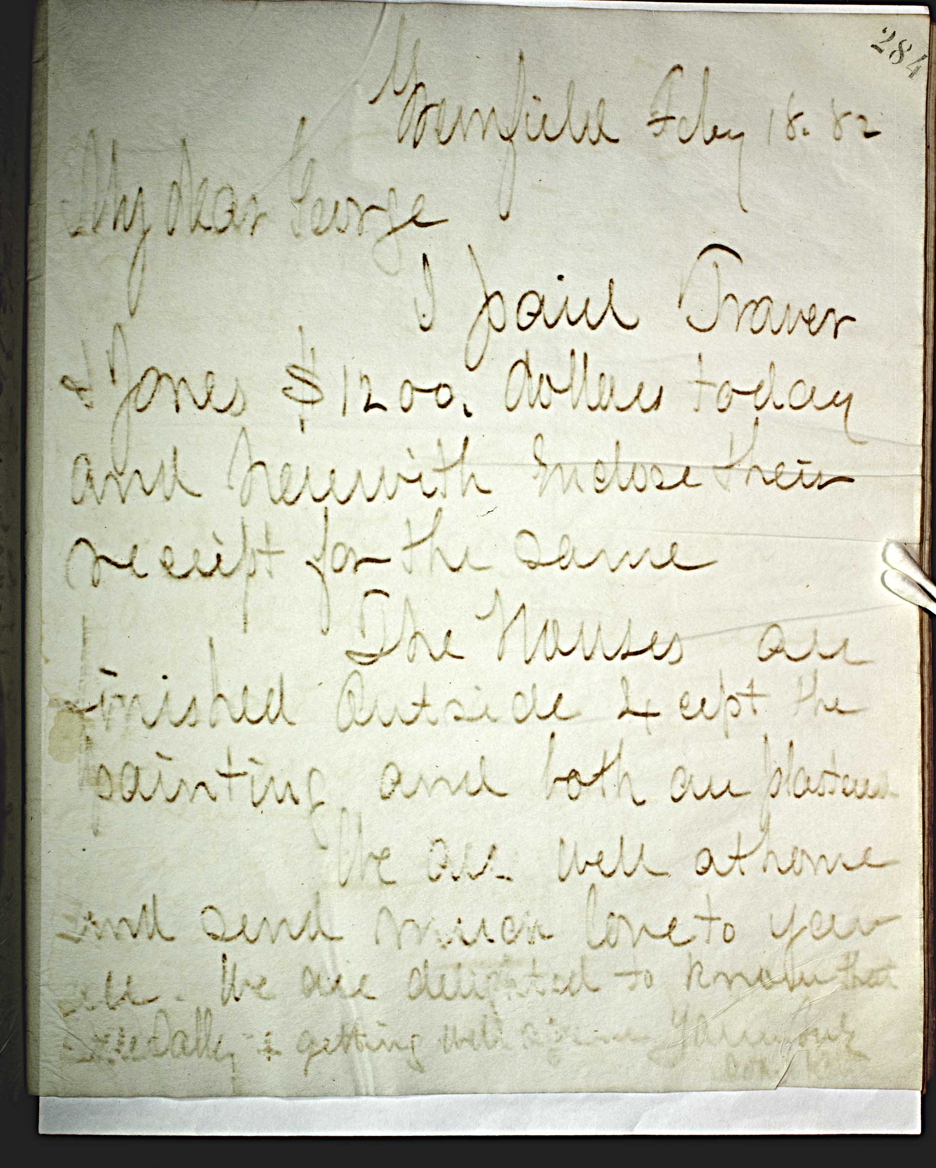 Greenfield Feby. 18, 82 [1882] -- My Dear George, -- I paid Traver & Jones $1200. Dollars today and herewith endorse their receipt for the same. -- The houses are finished outside except the painting and both are plastered. -- We are well at home and send much love to you all. We are delighted to know that little Sally is getting well again. -- Yours Truly -- John Keith --