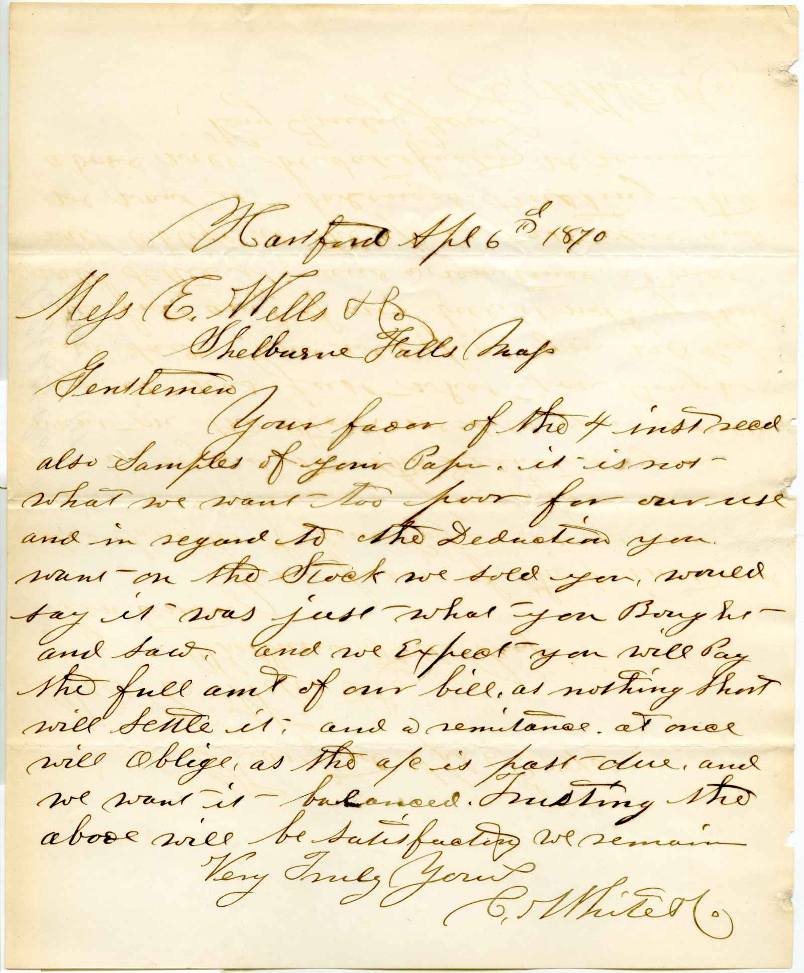 incoming correspondence to the papermaking company of Elisha Wells - circa 1870