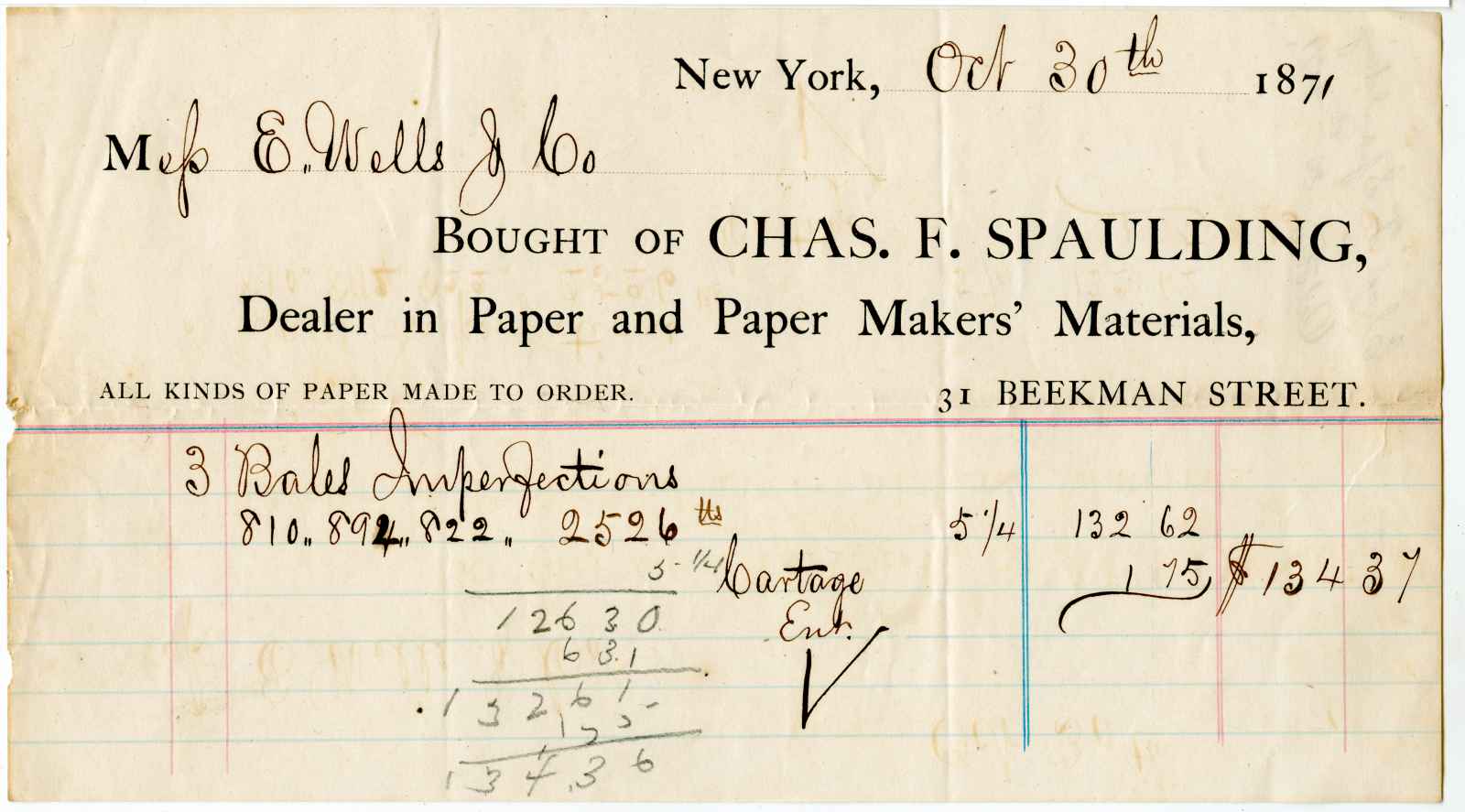 invoice; Spaulding, Charles F. & Co. - Paper & Paper Makers' Materials - N.Y.