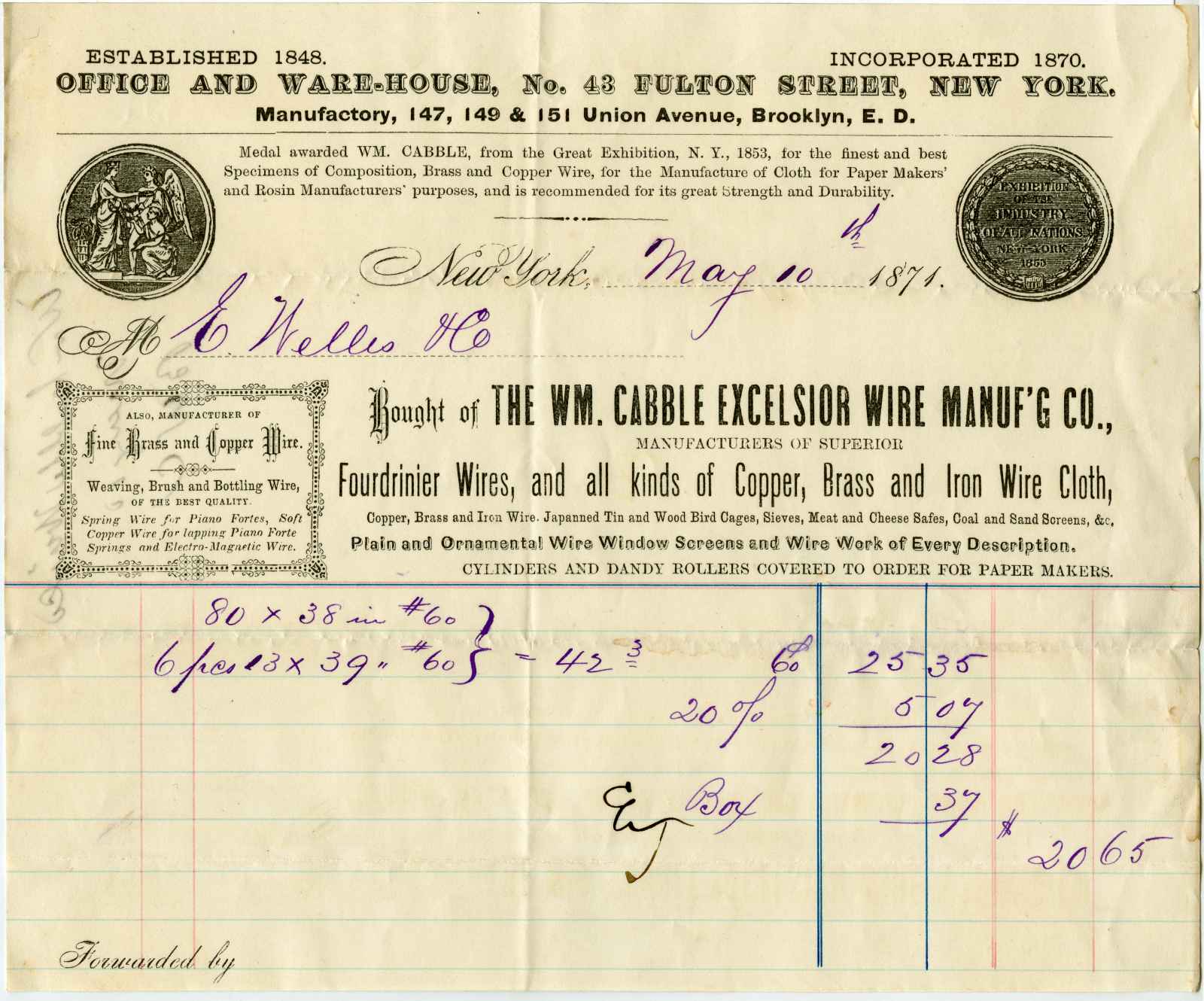 invoice; Cabble, William Excelsior Wire Mfg. Co - N.Y.