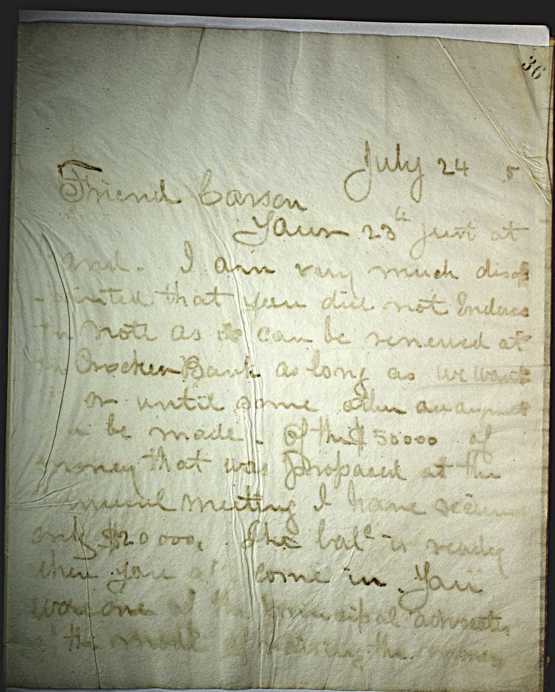 July 24 5 [1875] -- Friend Carson -- Your 23rd just at hand. I am very much disappointed that you did not endorse the note as can be renewed at the Crocker Bank as long as we want or until some other arrangements can be made - Of the $50,000 of money that was proposed at the annual meeting I have seen only $20,000 – The bal -- e- -- is ready when you can come in. You were one of the principal advocates of the model[?][?] the [?] --