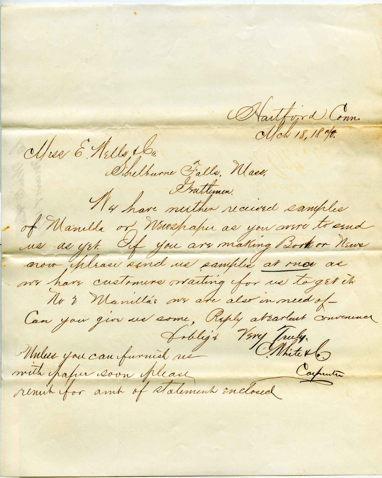 letter; White & Carpenter & Co. - Envelopes, Writing and Printing Papers - Hartford Ct.