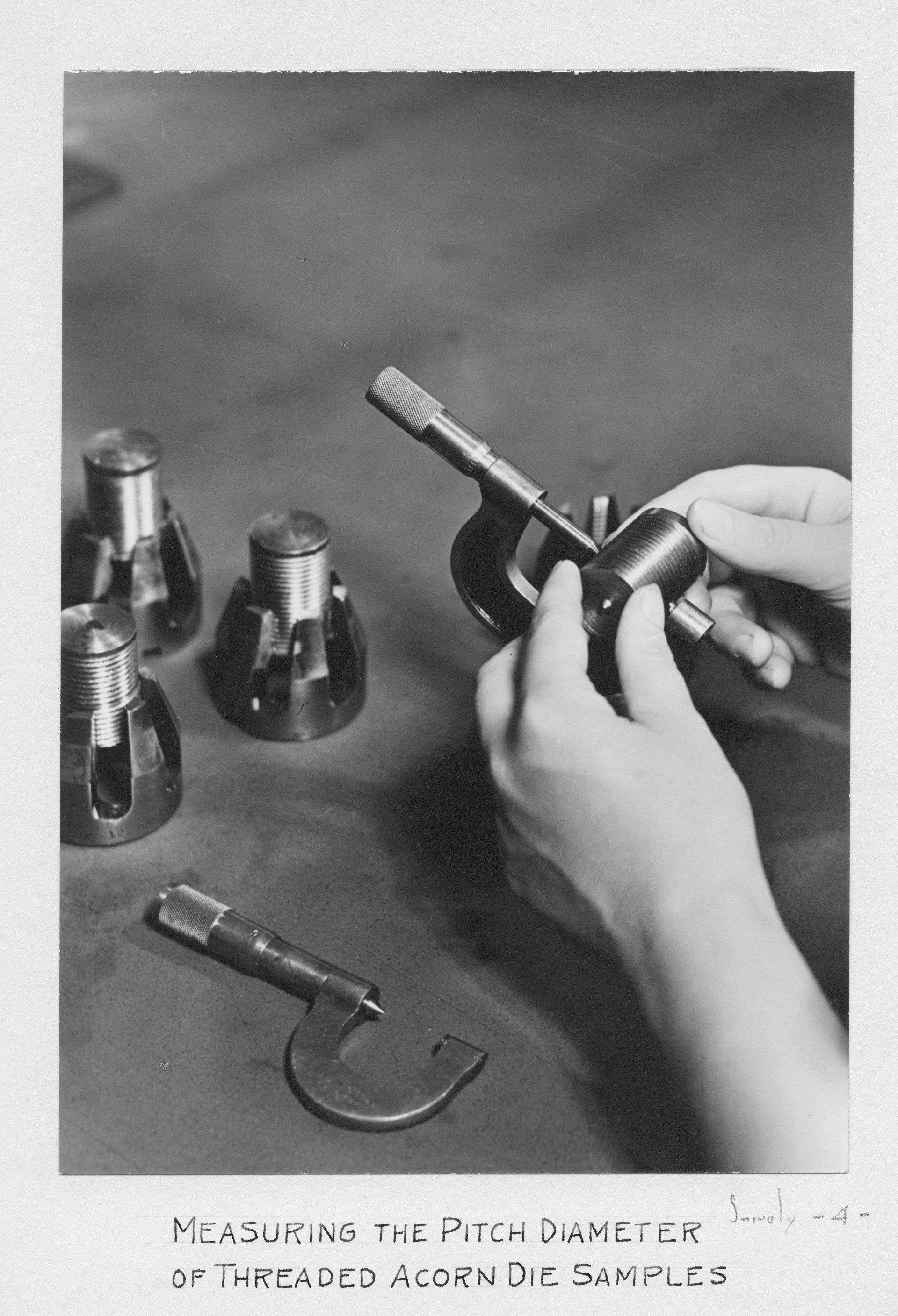 Measuring the Pitch Diameter of Threaded Acorn Die Samples -Photograph by Snively Deerfield Mass. 4
