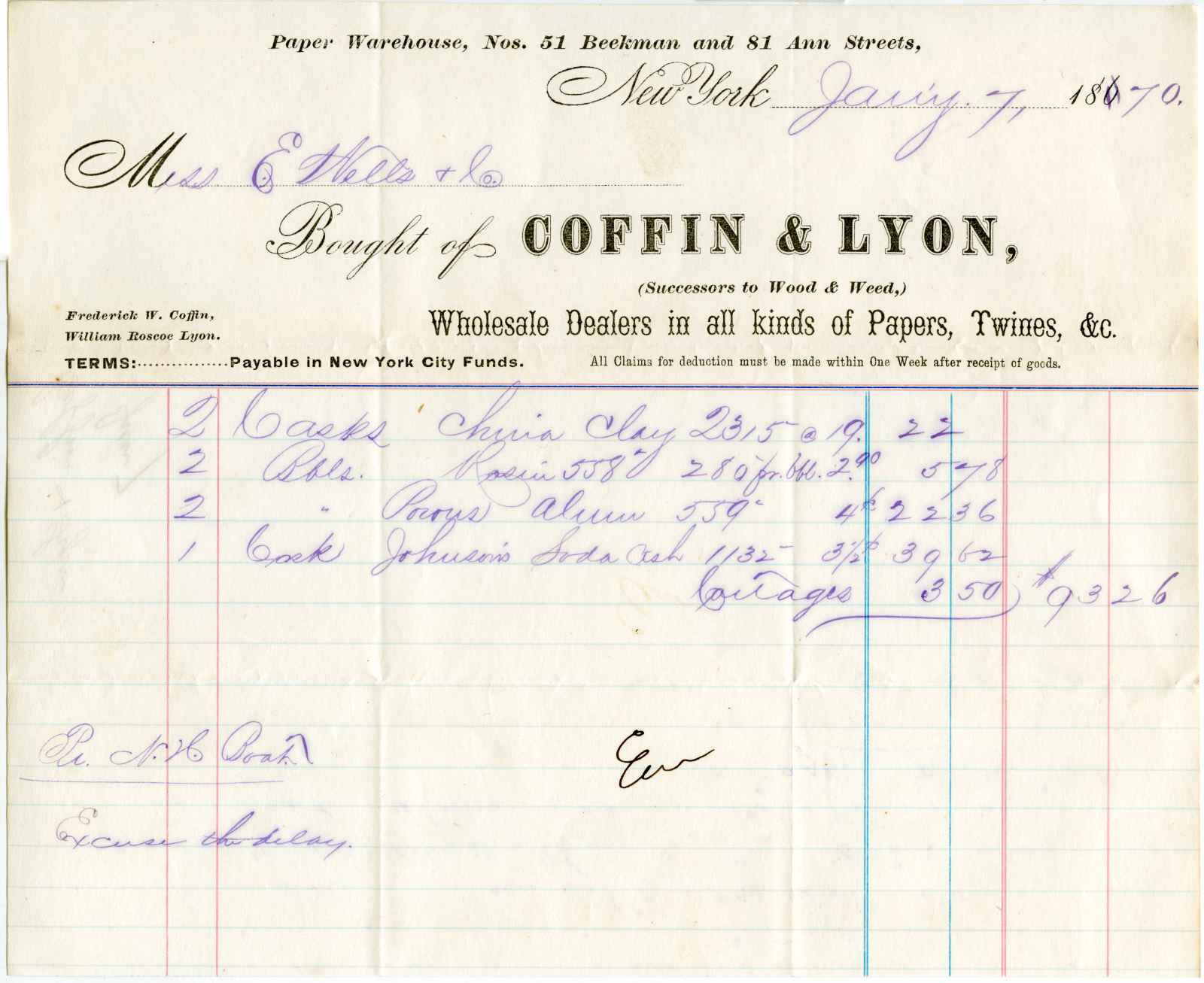 invoice; Coffin & Lyon - €” Wholesale Paper Warehouse - N. Y.