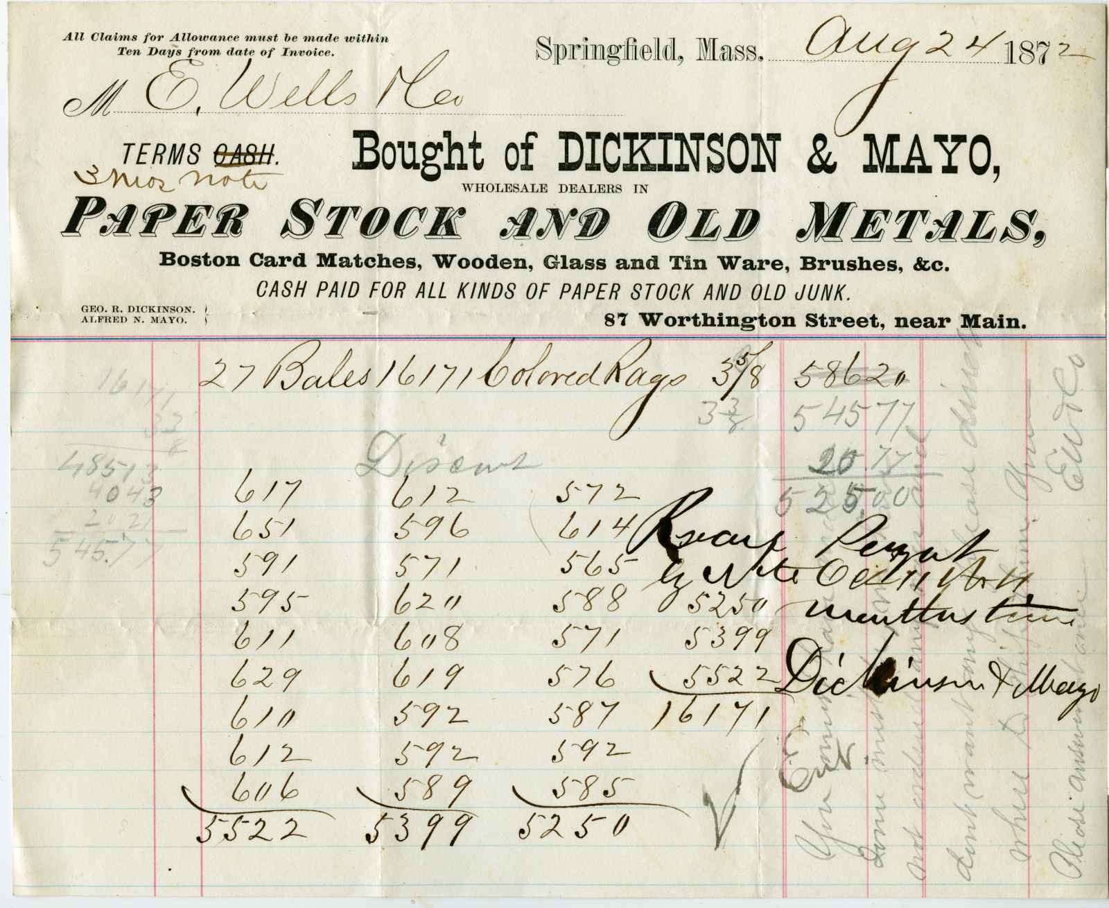 invoice; Dickinson & Mayo - Paper Stock & Old Metals - Springfield, Ma.