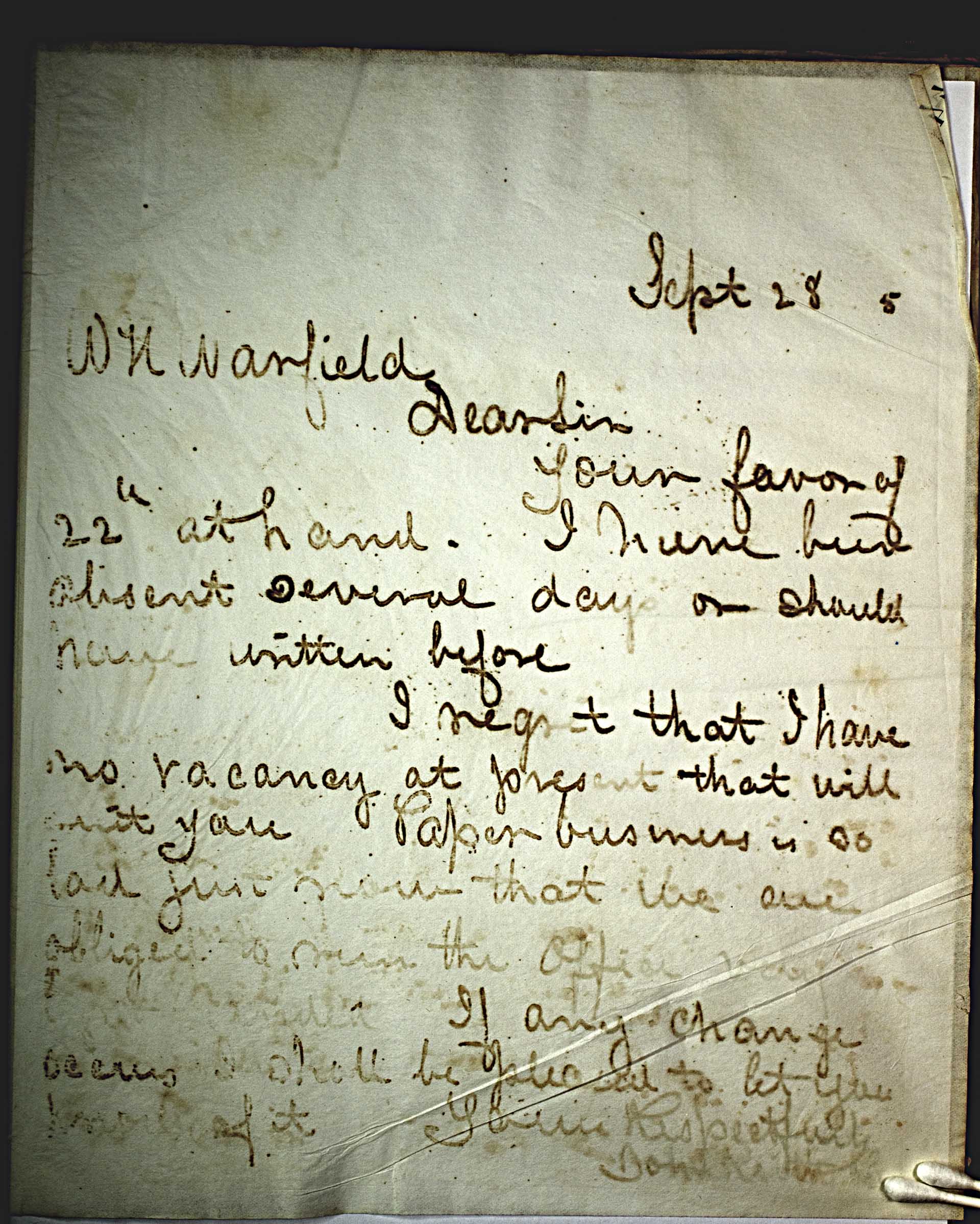 Sept 28 5 [1875] -- W H Warfield -- Dear Sir -- Your favor of 22nd at hand. I have been absent several days or should have written before I regret that I have no vacancy at present that will suit you Paper business is so bad just now that we are obliged to man the office very night. If any change occurs I shall be pleased to let you -- hear of it. -- Yours Respectfully -- John Keith --