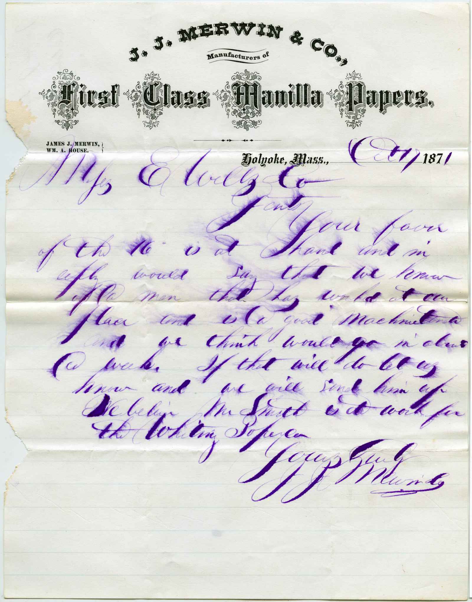 letter; Merwin, J. J. & Co. - First Class Manilla Papers - Holyoke, Ma.