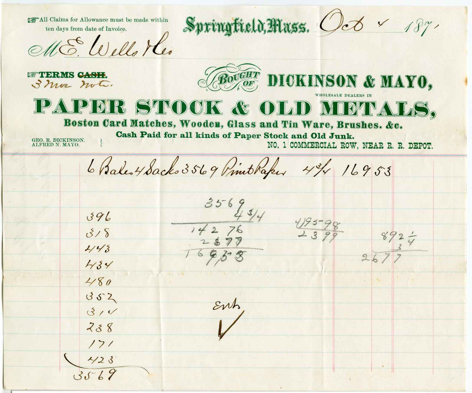invoice; Dickinson & Mayo - Paper Stock & Old Metals - Springfield, Ma.