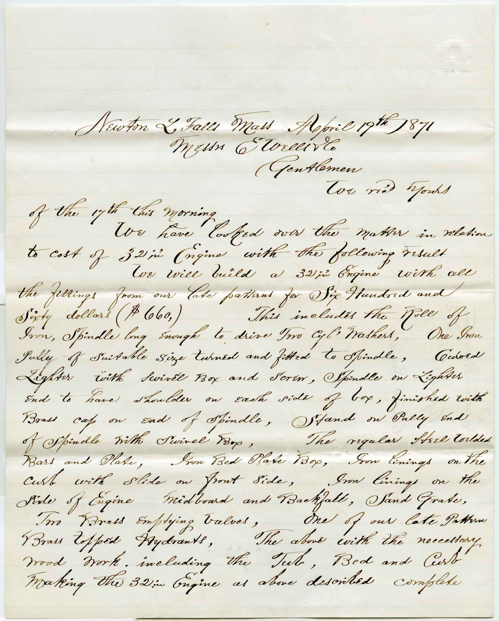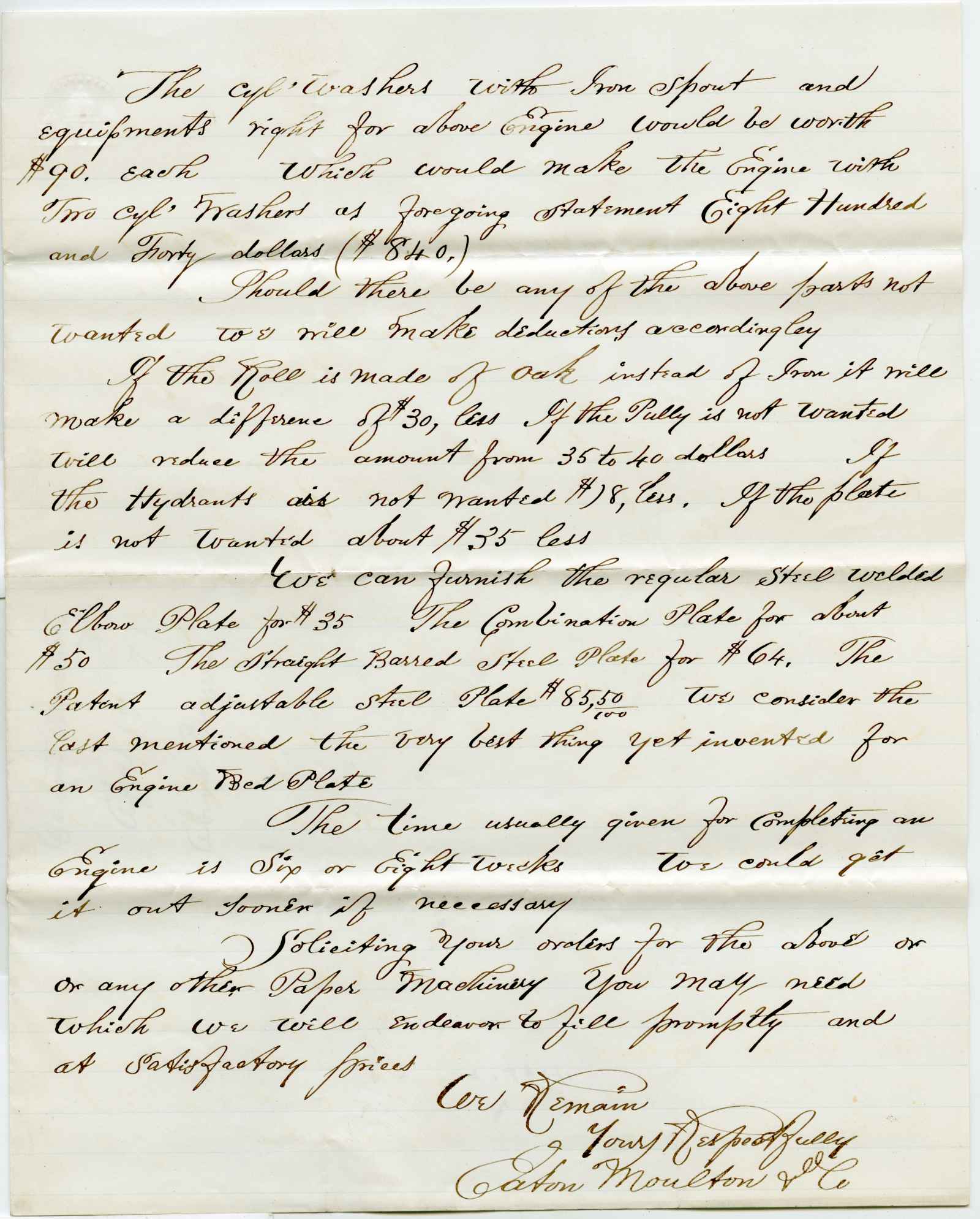 letter; Eaton, Moulton & Co. - All kinds of paper machinery - Newton Lower Falls, Ma.