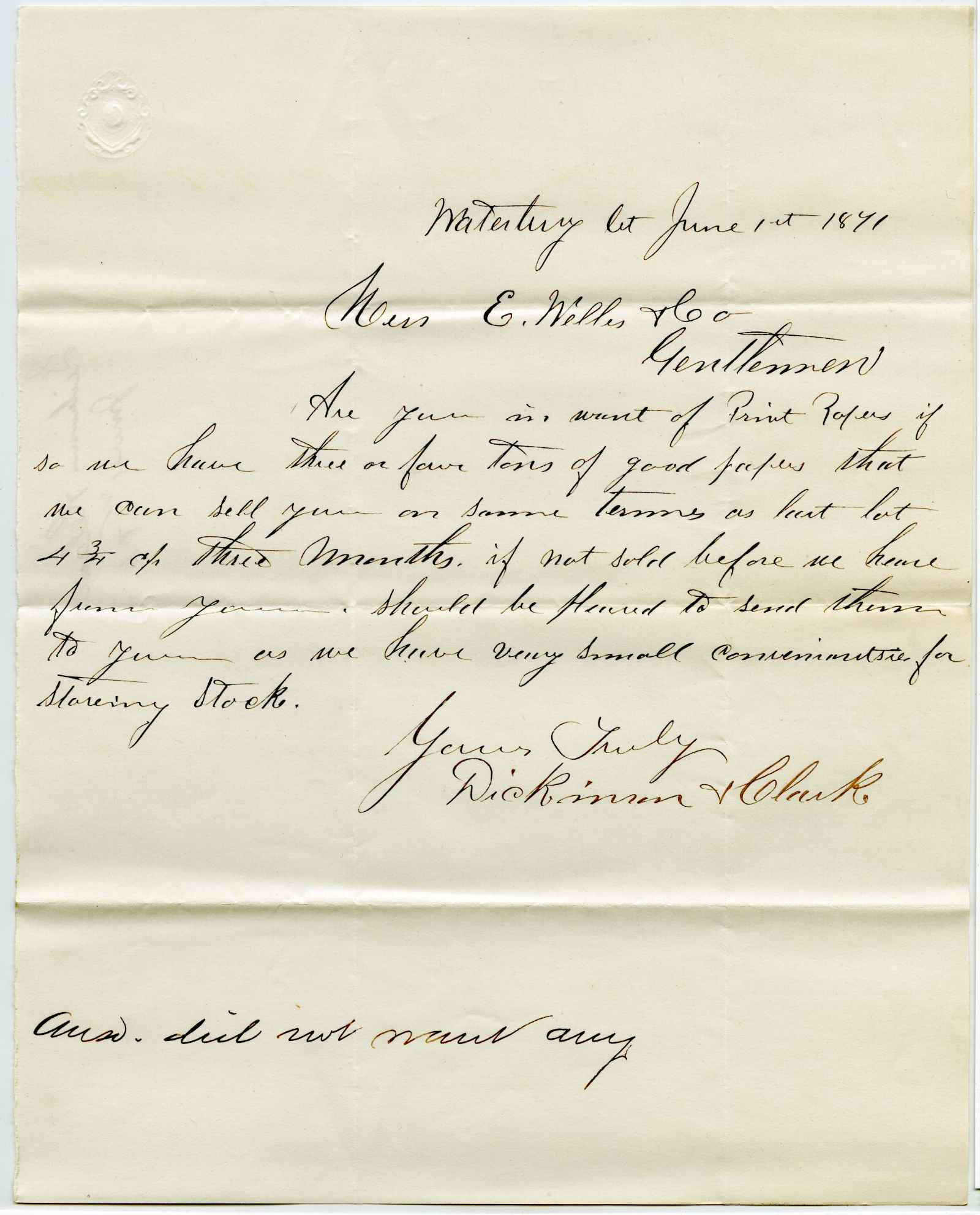 letter; Dickinson & Clark - Paper Sales - Waterbury, Ct.