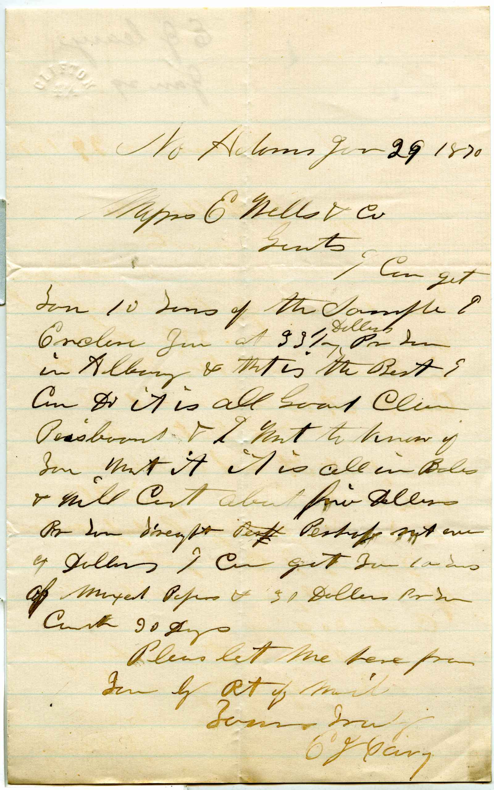 incoming correspondence to the papermaking company of Elisha Wells - circa 1870