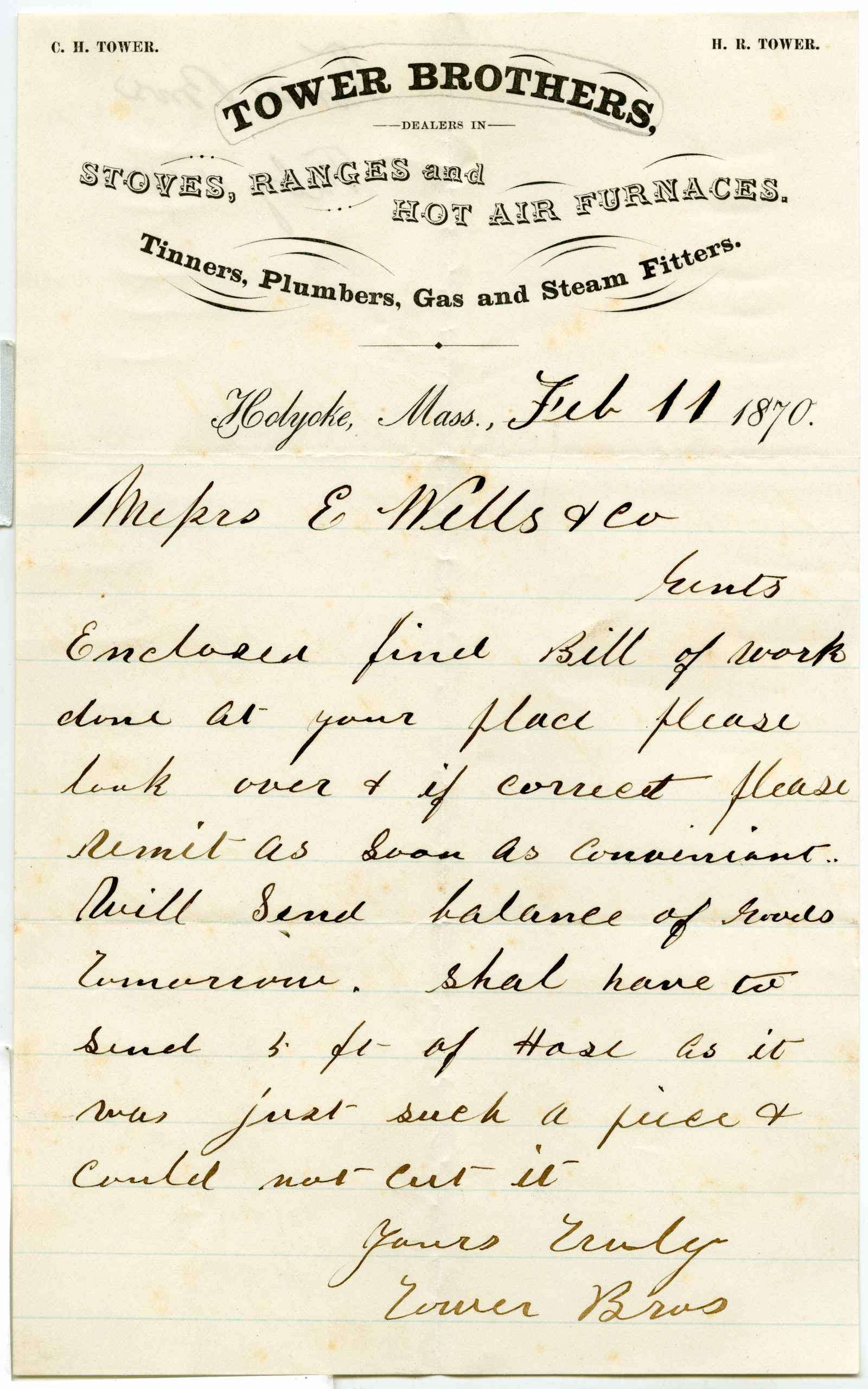 letter; Tower Bros. - Stoves, Hot Air Furnaces, House Finishing Goods - Holyoke, Ma.