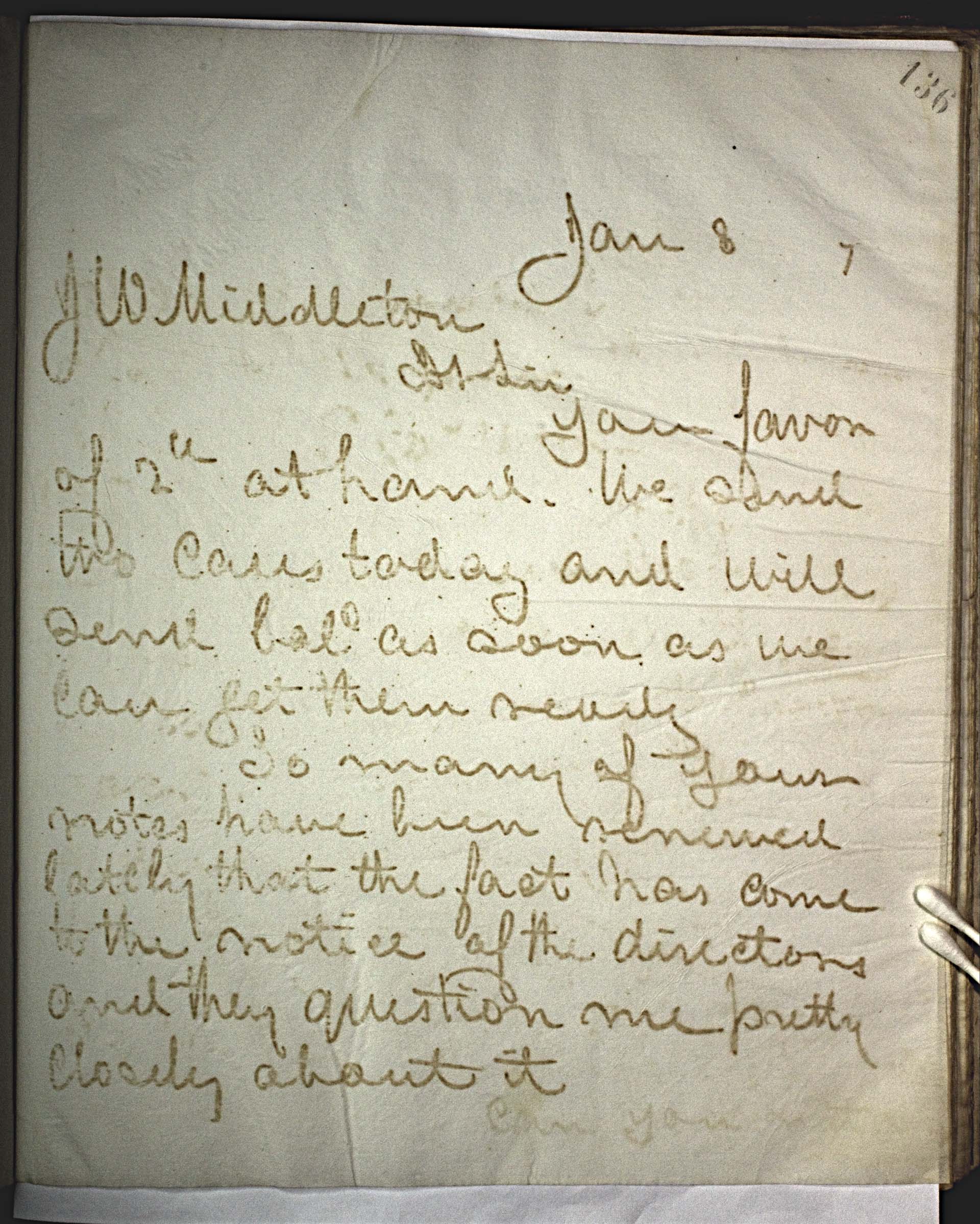 Jan 8 6 [1876] -- J. W. Middleton -- Dear Sir, -- Your favor of 2 -- d -- at hand. We send two cars today and will send bal -- a -- as soon as we can get them ready. -- So many of your notes have been renewed lately that the fact has come to the notice of the directors and they question me pretty closely about it. -- Can you [please] --