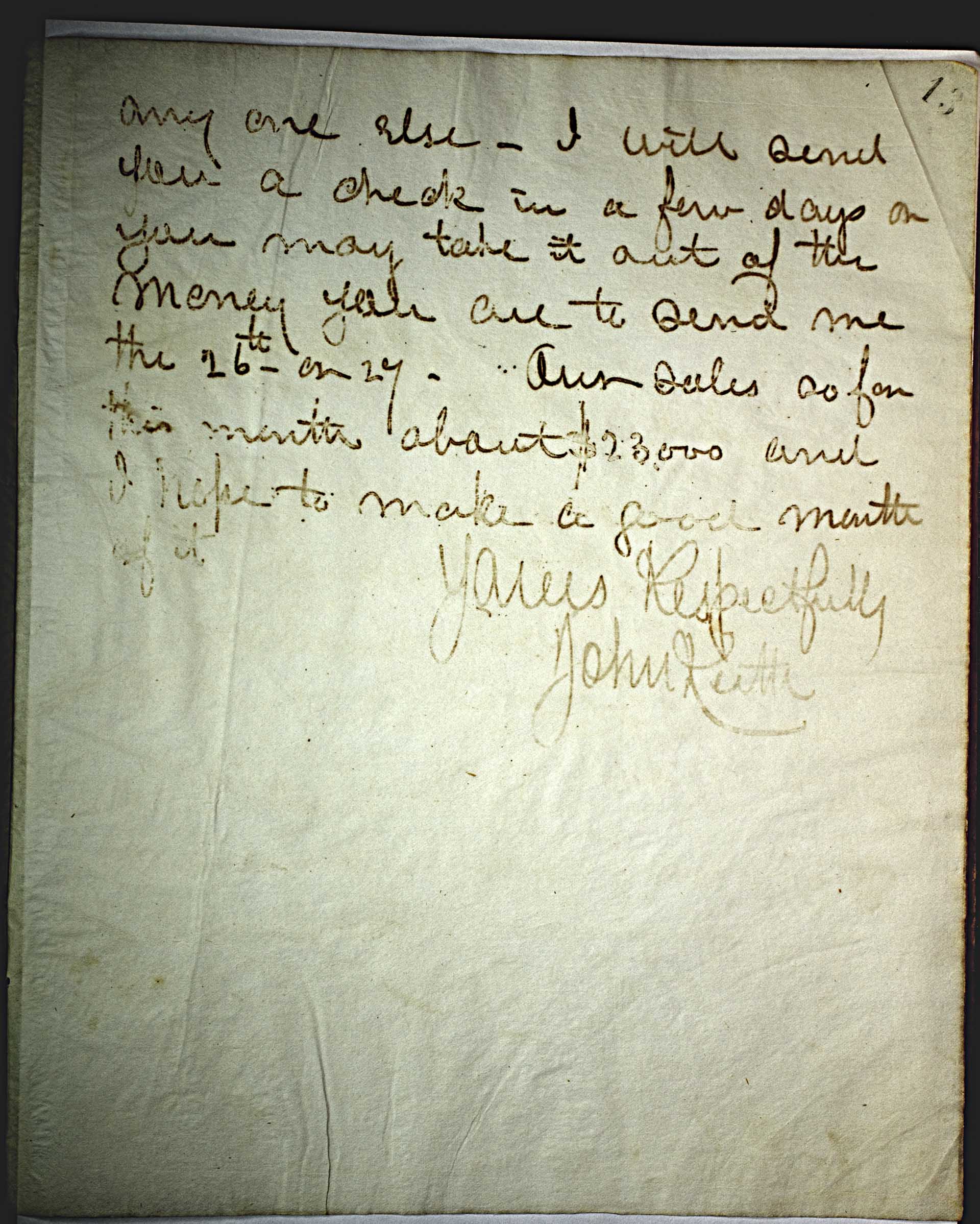 anyone else – I will send you a check in a few days or you may take it out of the money you are to send me the 16th or 27. Our sales so far this month about $23,000 and I hope to make a good month of it. -- Yours Respectfully -- John Keith --