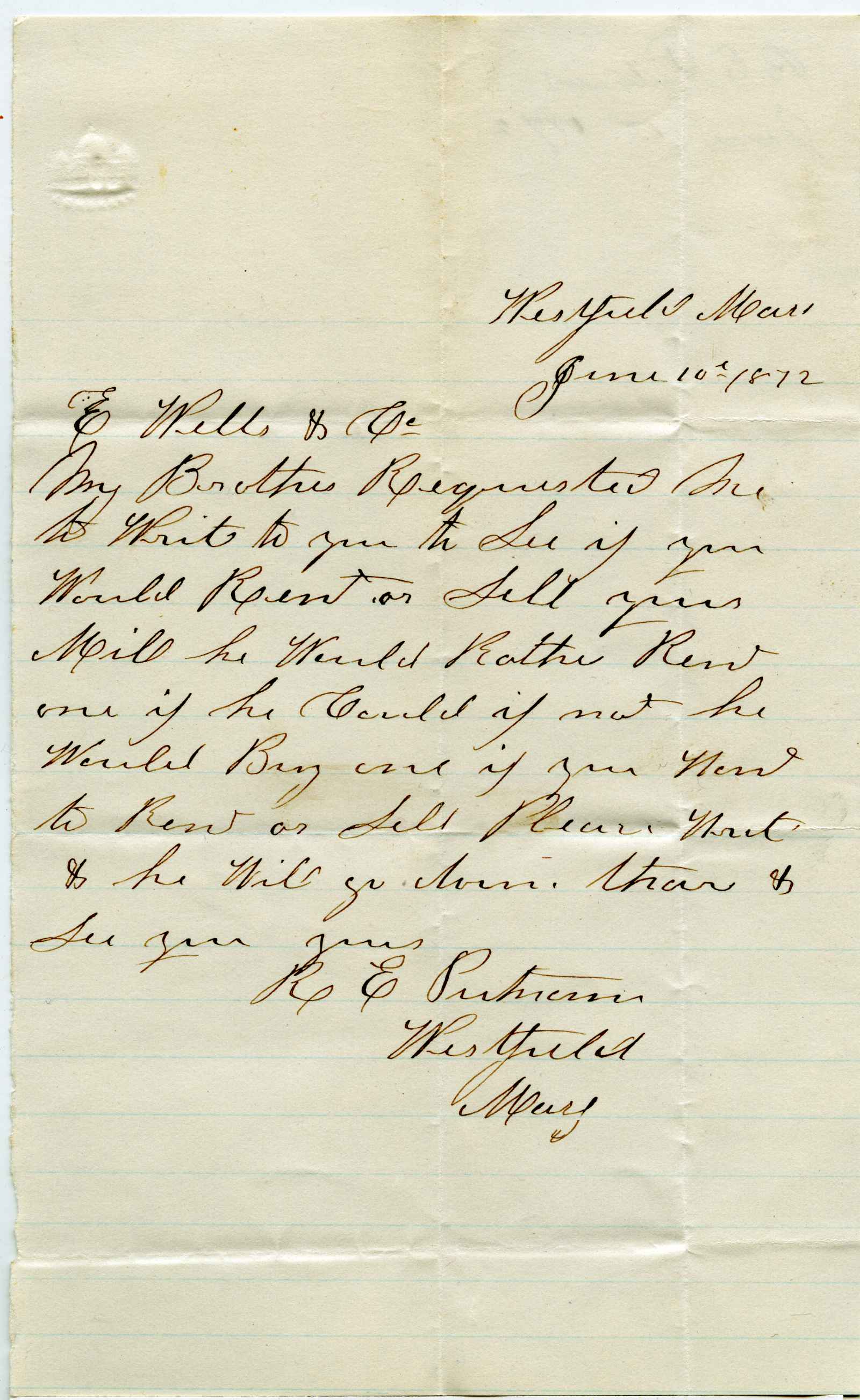 letter; Putnam, R. E. - Mill rental - Westfield, Ma.