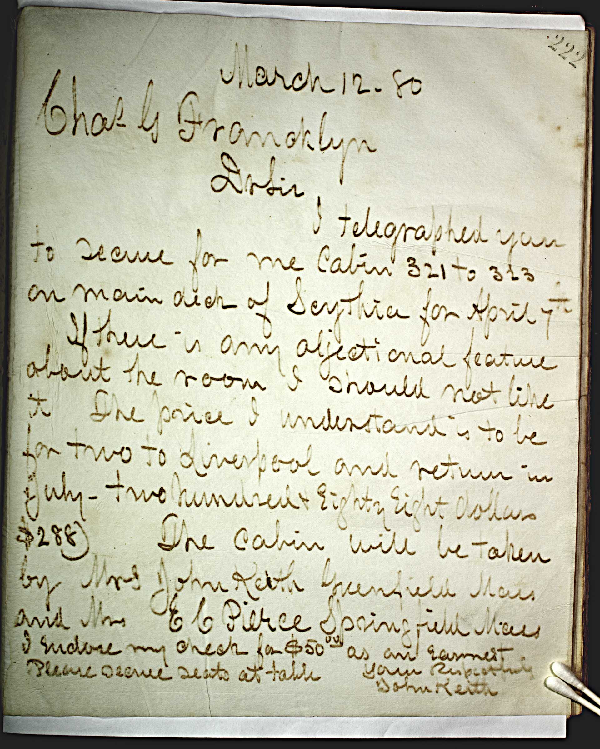 March 12, 80 [1880] -- Chas. G. Franklyn -- Dr Sir, -- I telegraphed you to secure for me cabin 321 to 323 on main deck on Scythia for April 7th . -- If there is any objectional feature about the room I should not like it. The price I understand is to be for two to Liverpool and return in July. Two hundred & eighty eight dollars $288. The cabin will be taken by Mrs. John Keith Greenfield Mass. and Mrs. E. L. Pierce Springfield Mass. -- I endorse my check for $50.00 -- as am earnest. -- Please secure seats at table. -- Yours Respectfully -- John Keith --