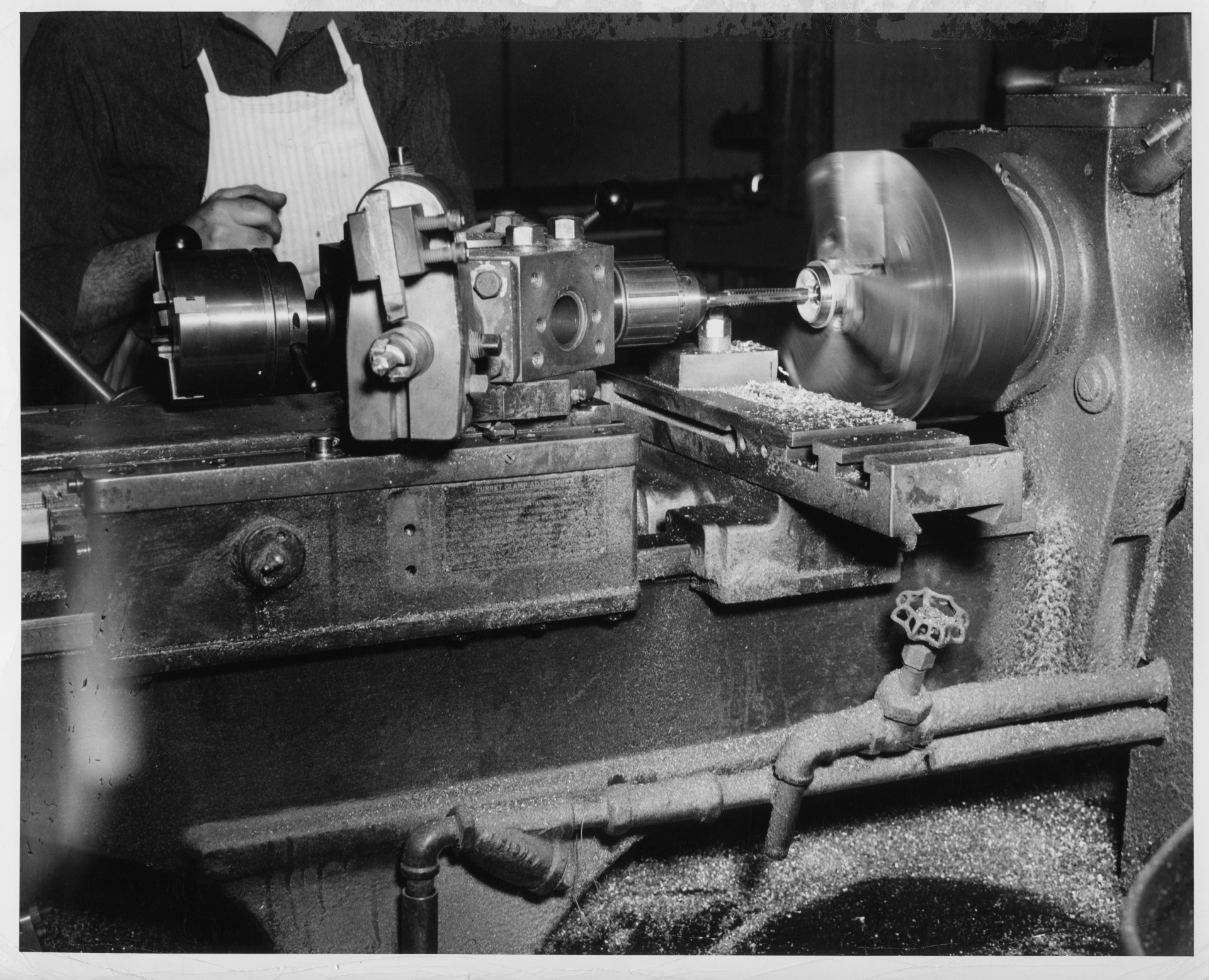 Editor's Note: A tapered tap is threading a lathe mounted metal component.