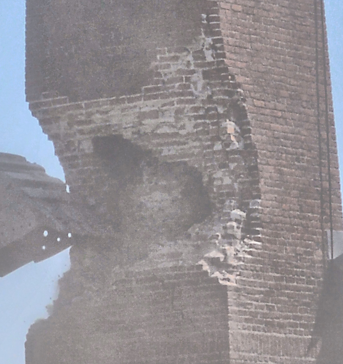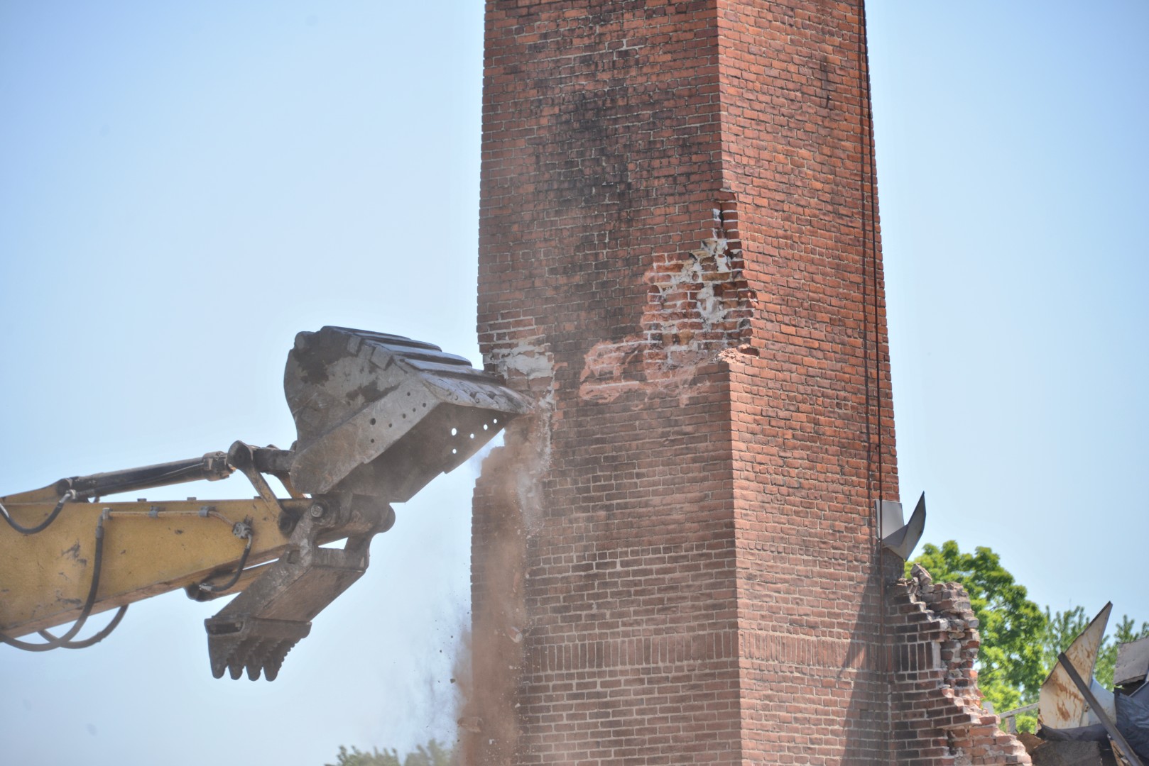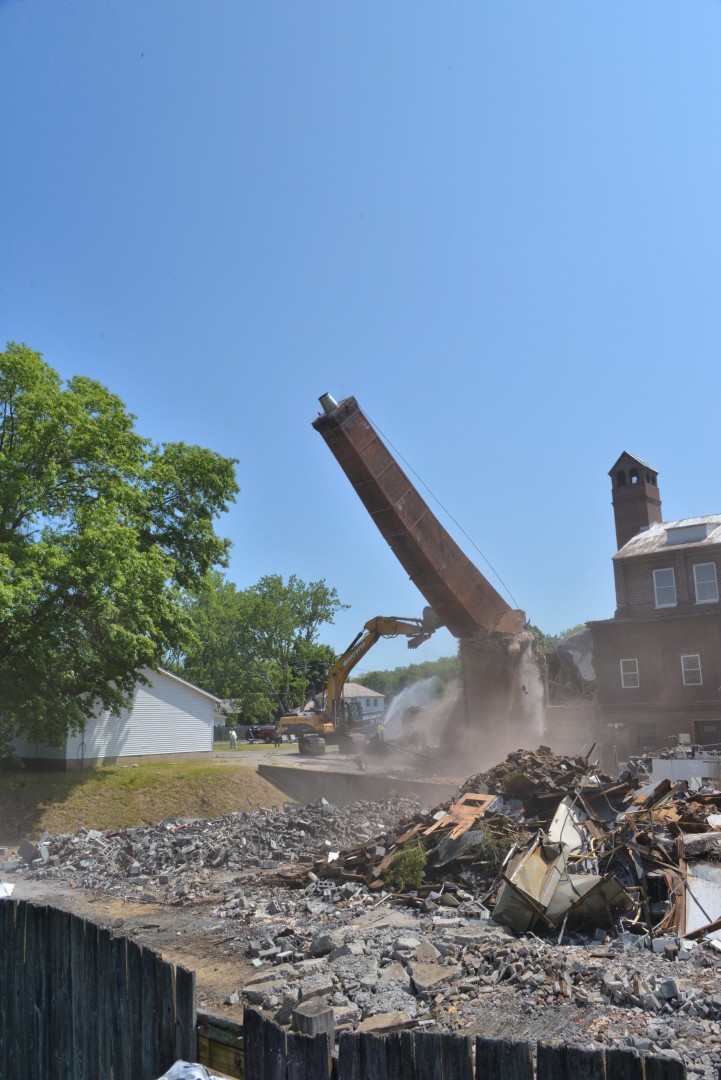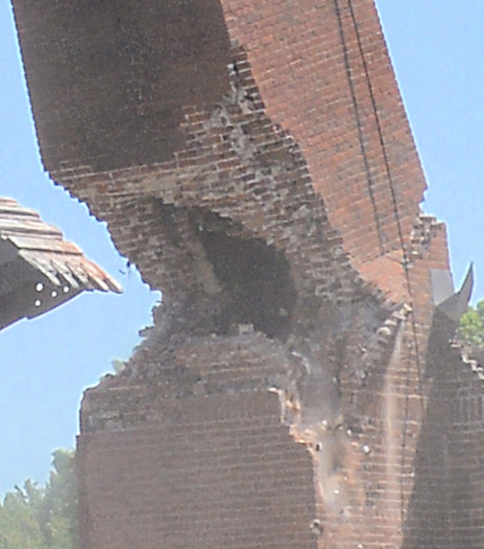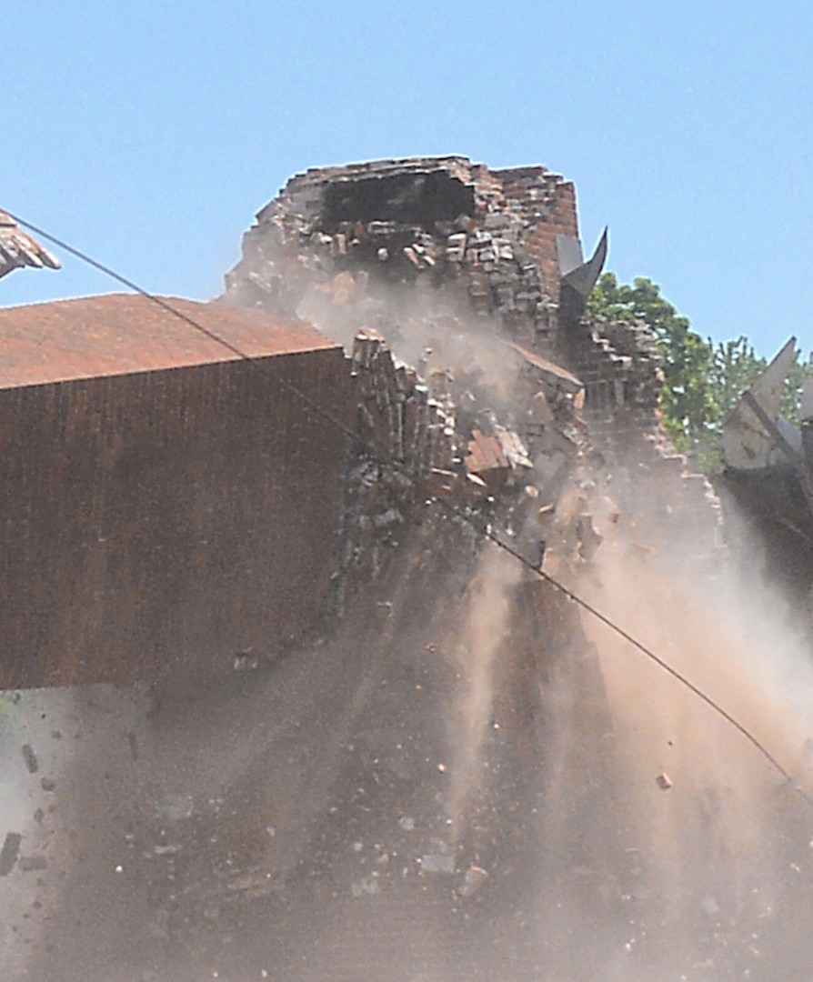 A gallery of 30 photos showing the demolition of the Physical Plant 80-foot-high chimney.