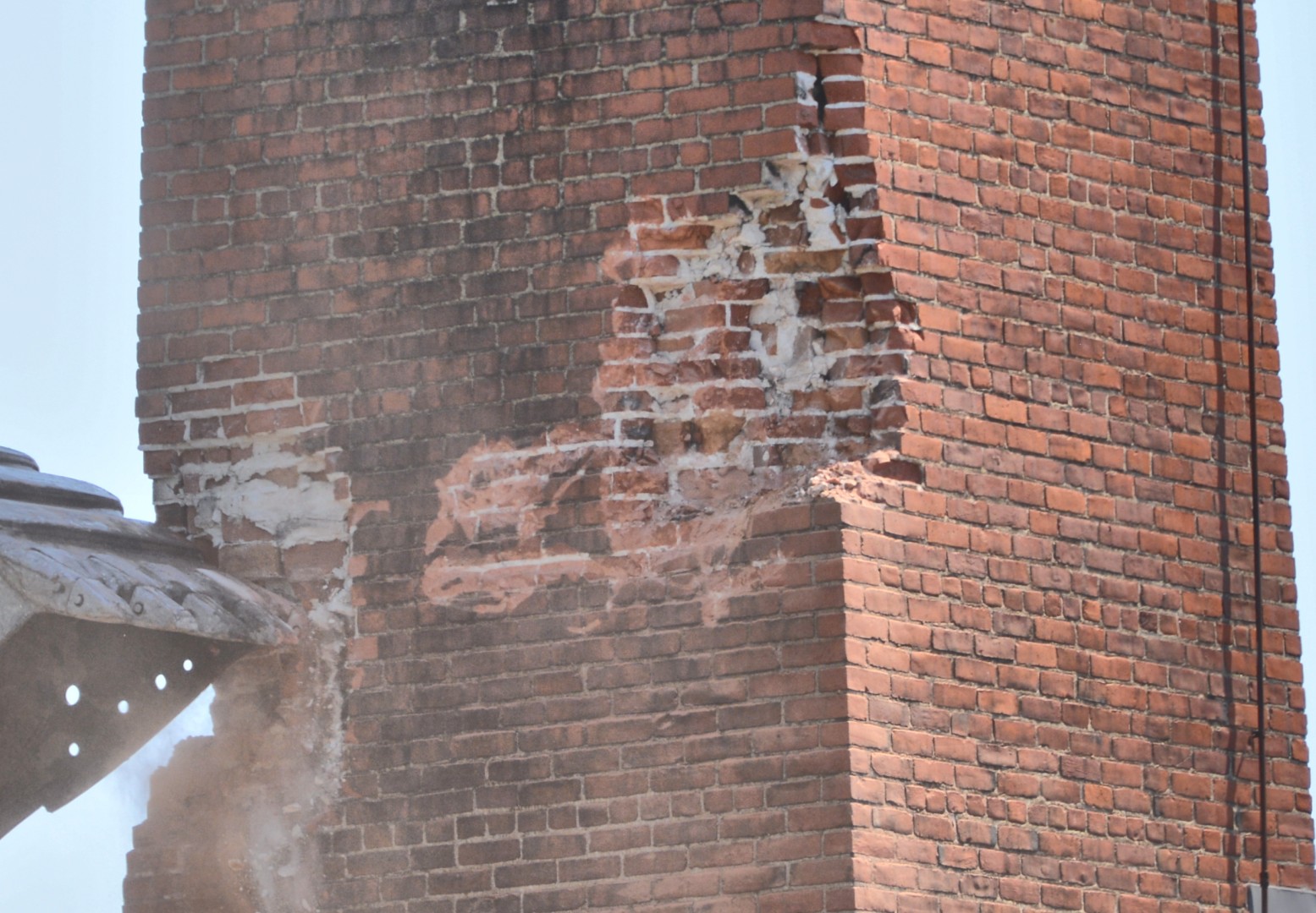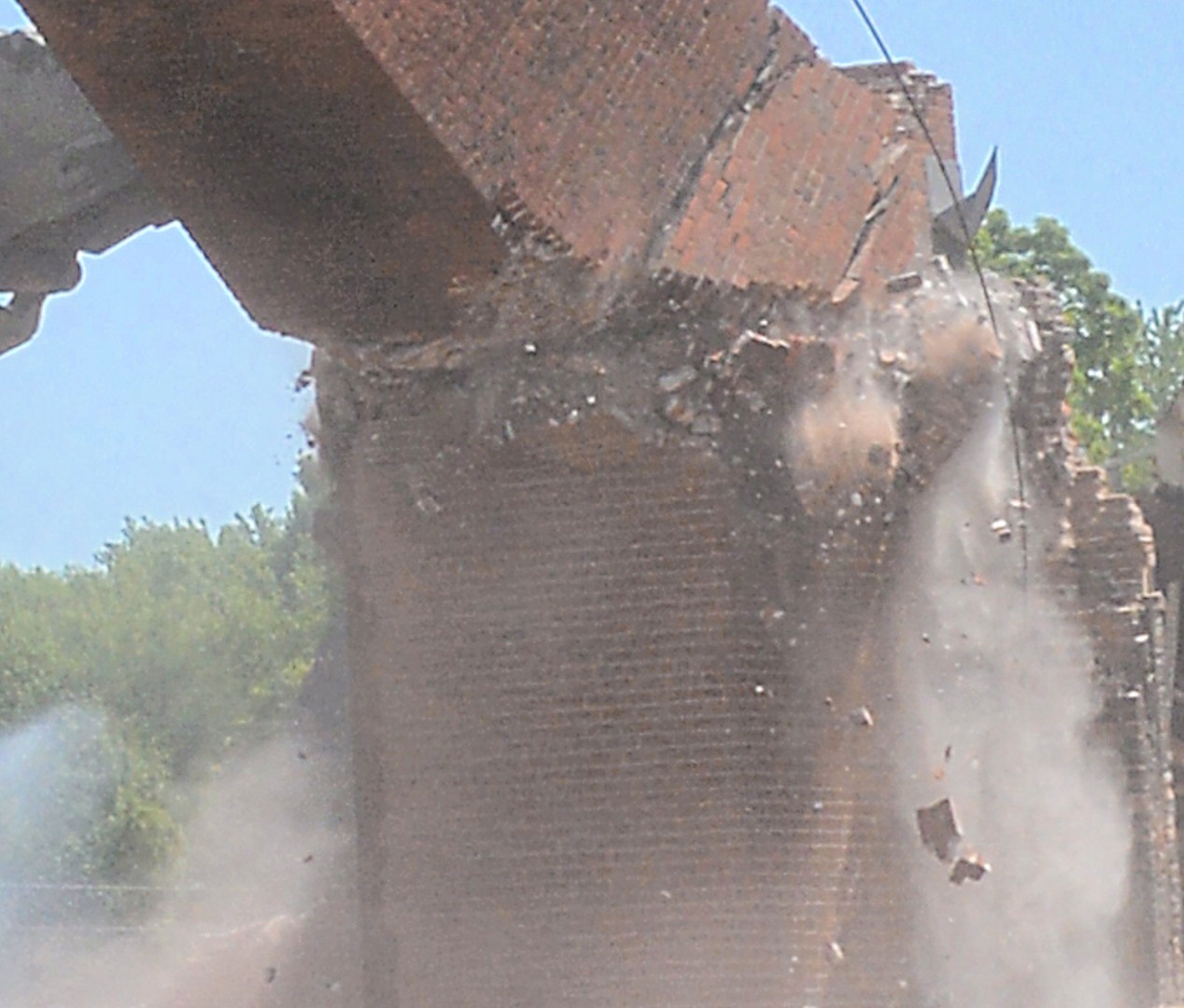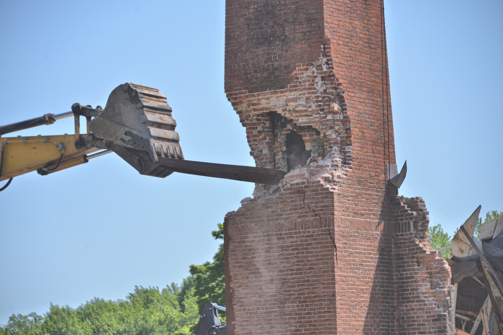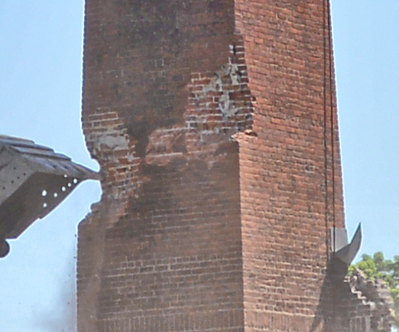 A gallery of 30 photos showing the demolition of the Physical Plant 80-foot-high chimney.