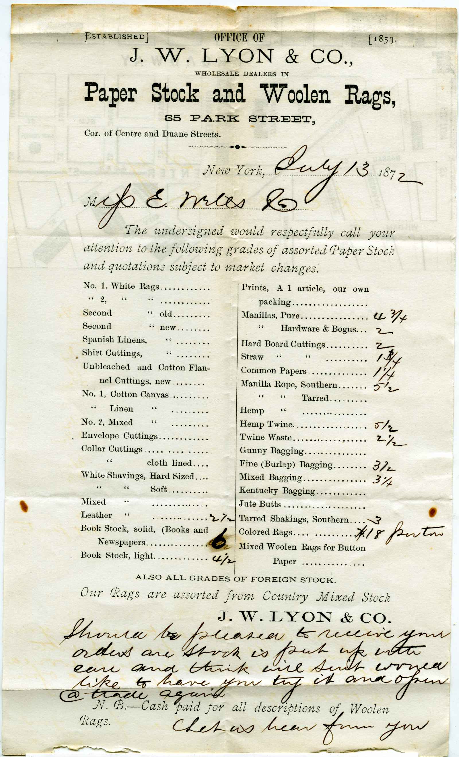 ad; Lyon, J. W. & Co. - Cotton and Woolen rags, Rope, Bagging, Canvas - N.Y.