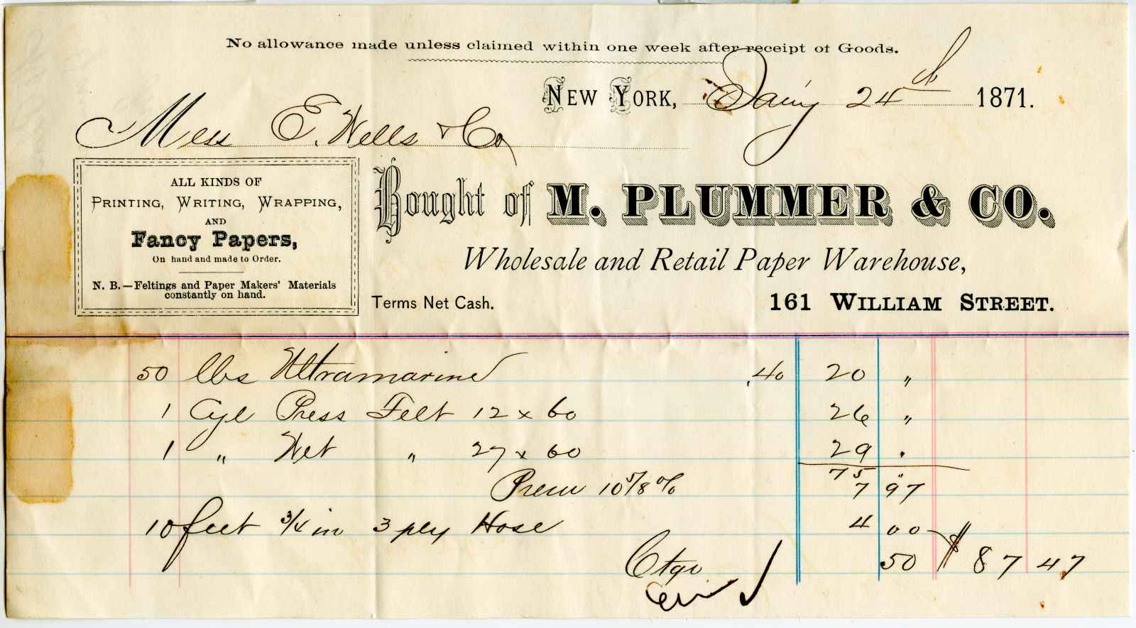 | dc.description | receipt; Plummer, M. & Co. - Wholesale & Retail paper Dealers - N.Y. | |